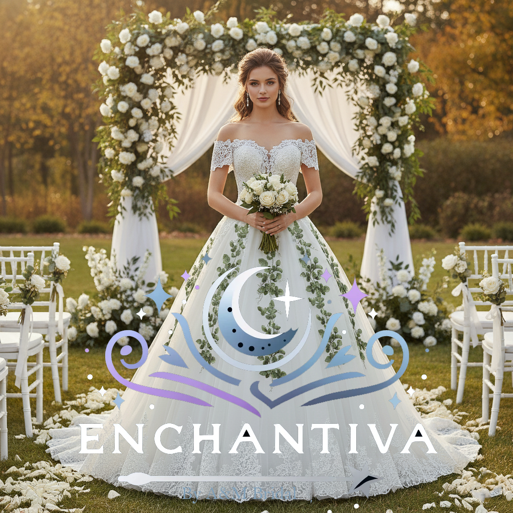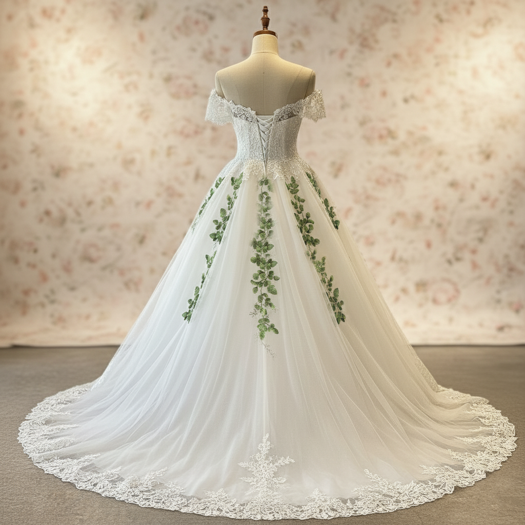 Step into a fairytale with the Emerelle gown — a breathtaking creation that celebrates nature, romance, and timeless grace. Designed for the bride who dreams of walking through an enchanted garden, Emerelle features cascading embroidered green vines that flow from the lace bodice down the full tulle skirt, creating a soft, organic elegance unlike any other.
