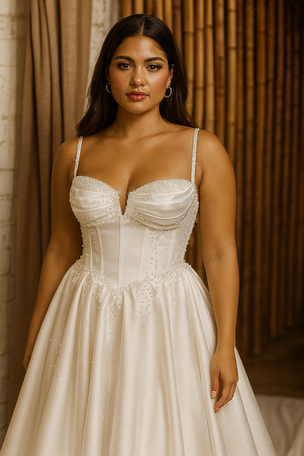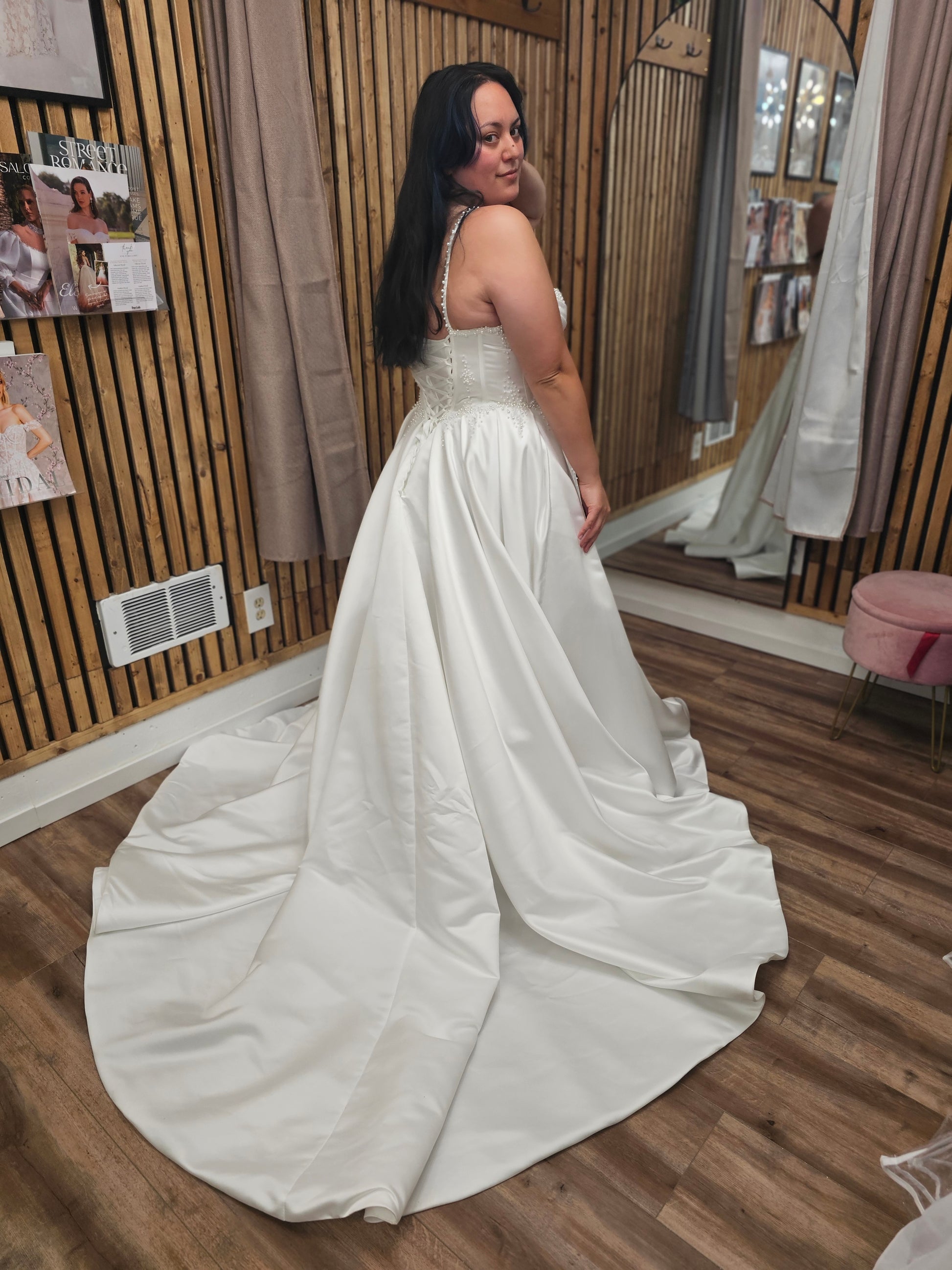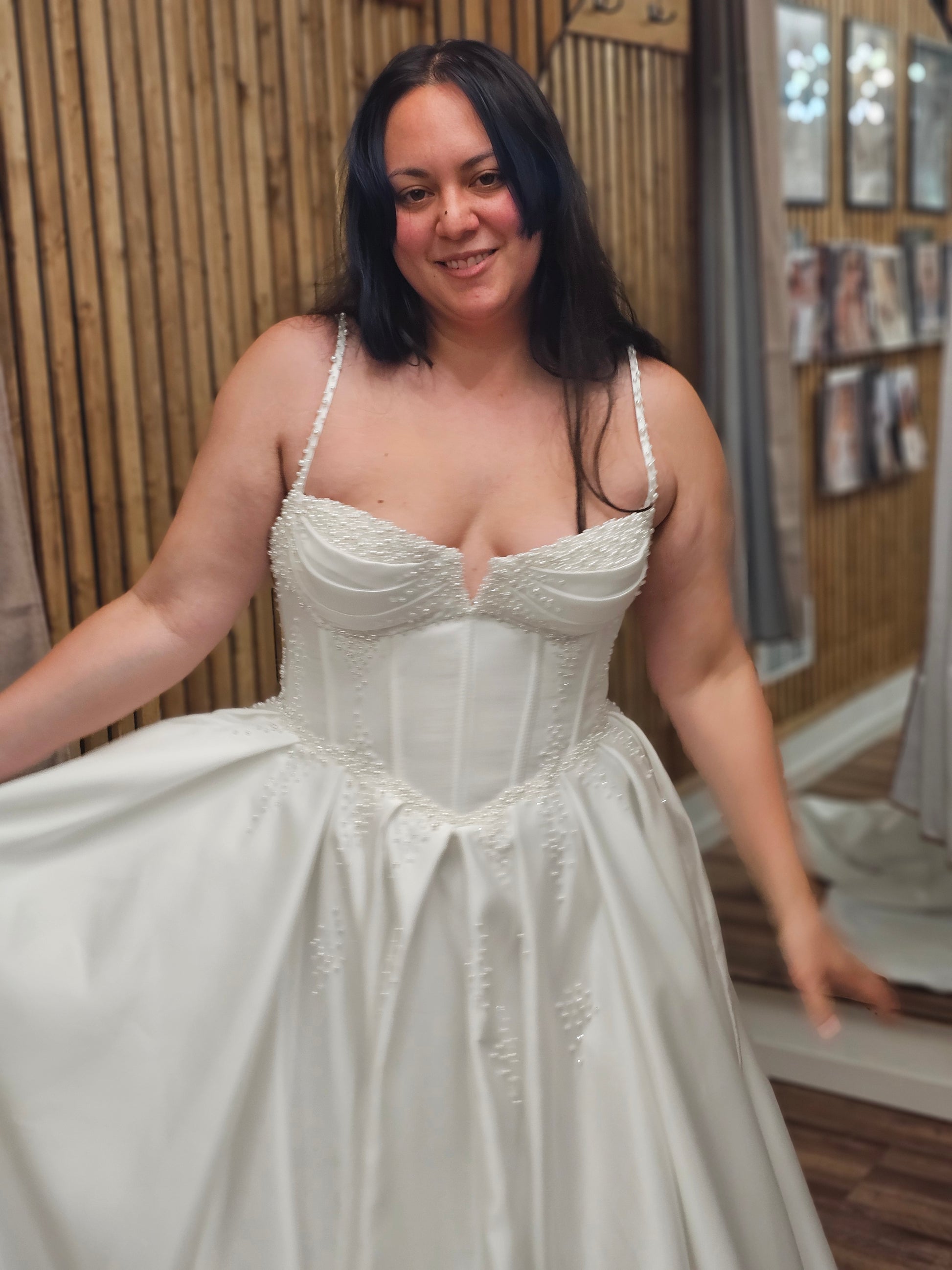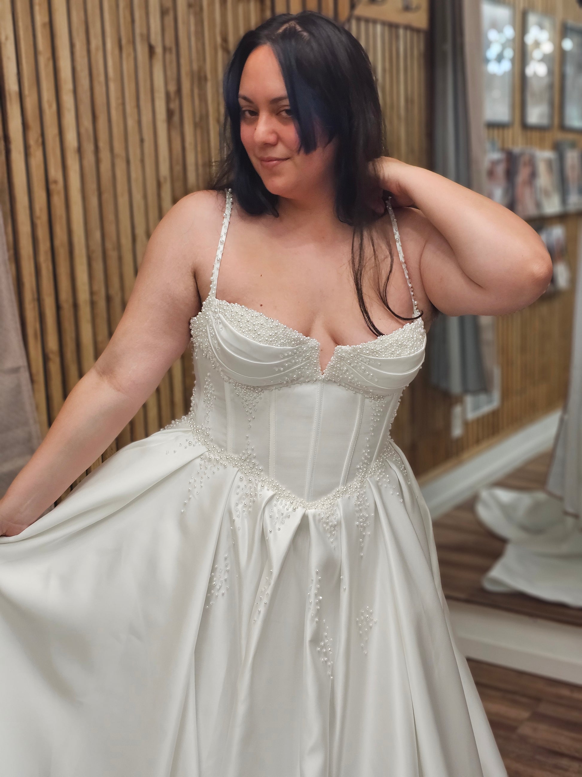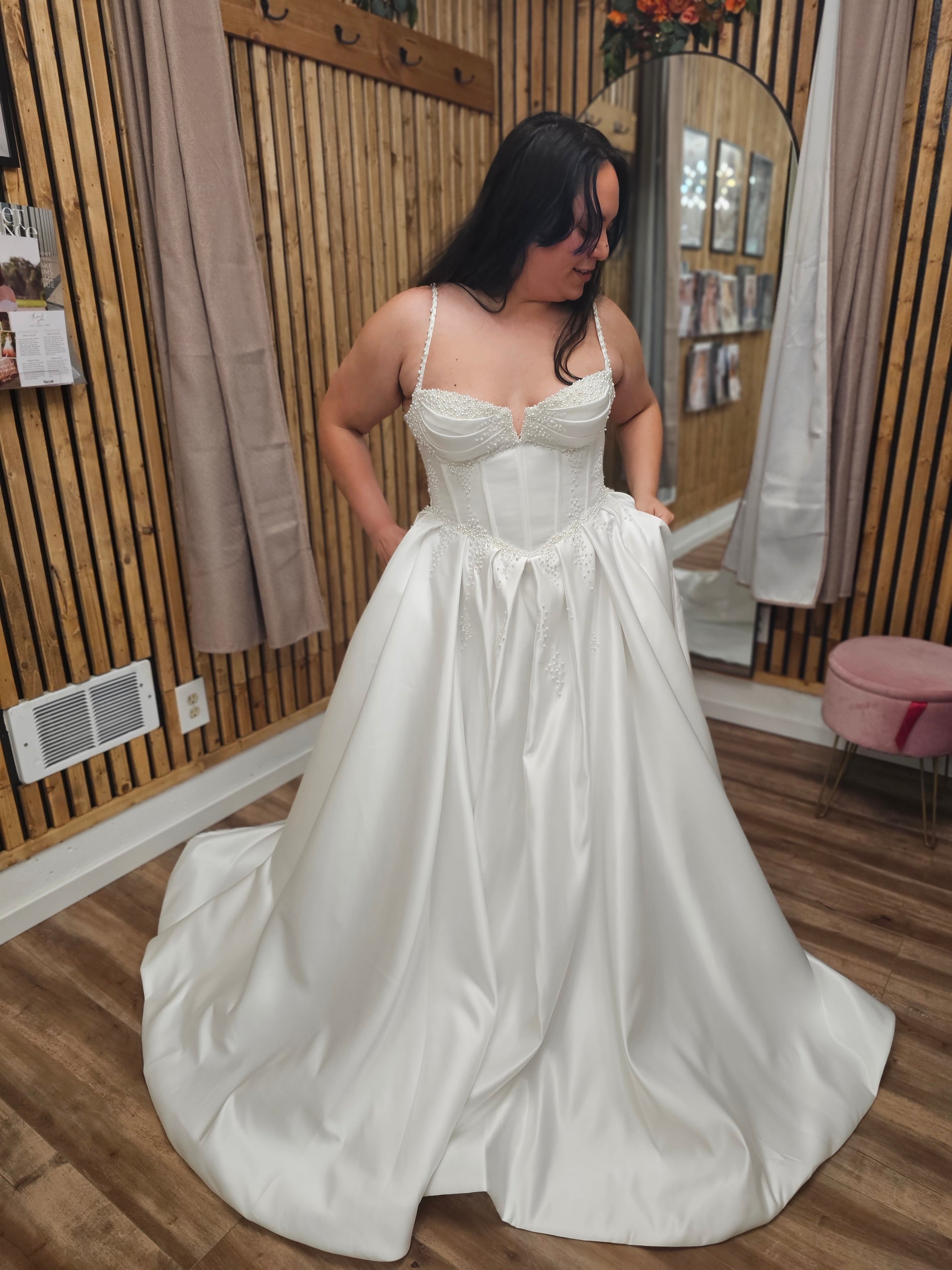 Make your grand entrance in Emmaleigh, a breathtaking satin bridal gown designed for timeless romance and modern elegance. This luxurious wedding dress features a structured corset bodice with exposed boning, pearl-beaded spaghetti straps, and delicate hand-placed beadwork at the waist. The flattering neckline is subtly notched for a sculpted silhouette that blends classic beauty with contemporary flair.