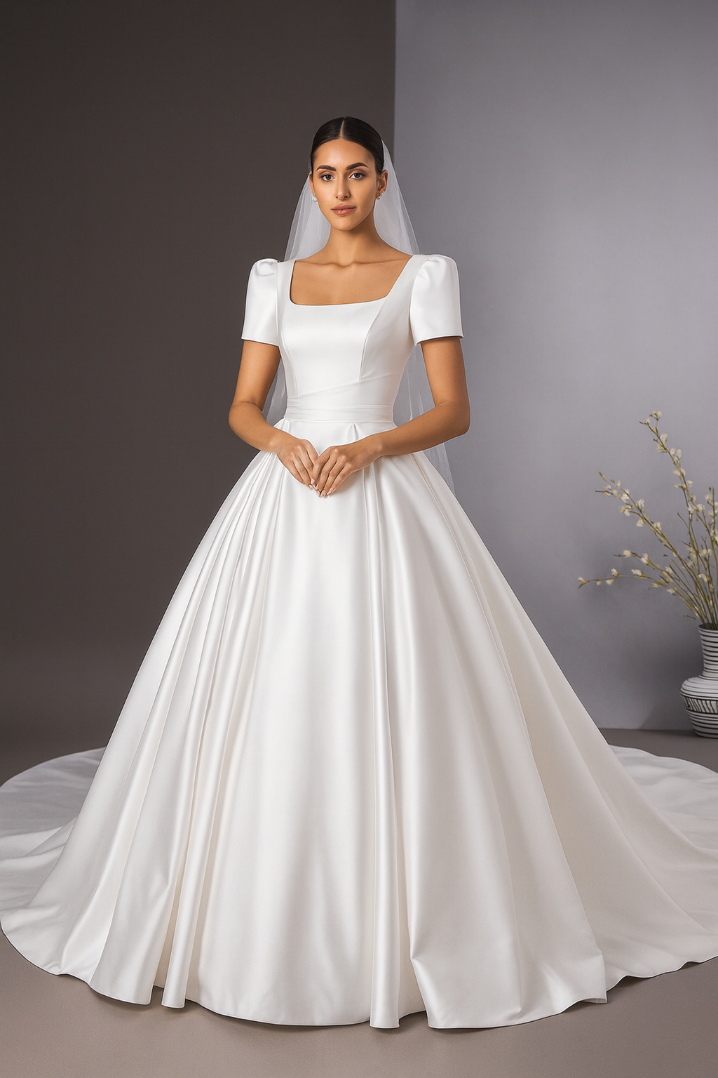 Eulalie – Modest Satin Ball Gown Wedding Dress with Puff Sleeves & Square Neckline