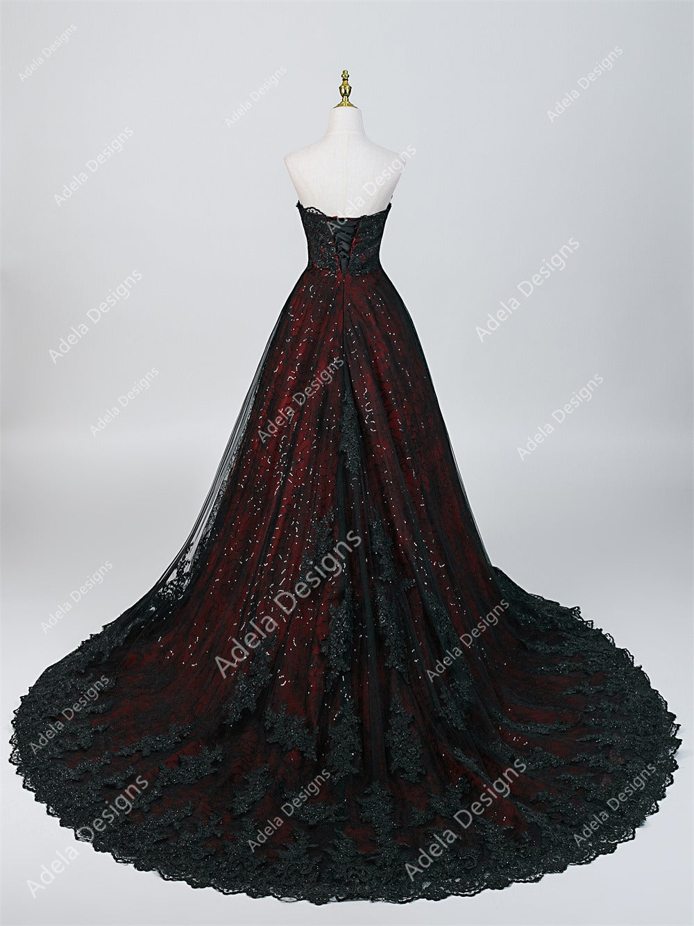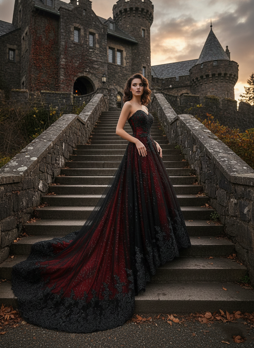 Fabienne is an elegant strapless high-low Gothic wedding dress that blends vintage drama with a modern edge. Designed in a rich black base layered over dark red, this gown creates a striking contrast that feels both romantic and daring.