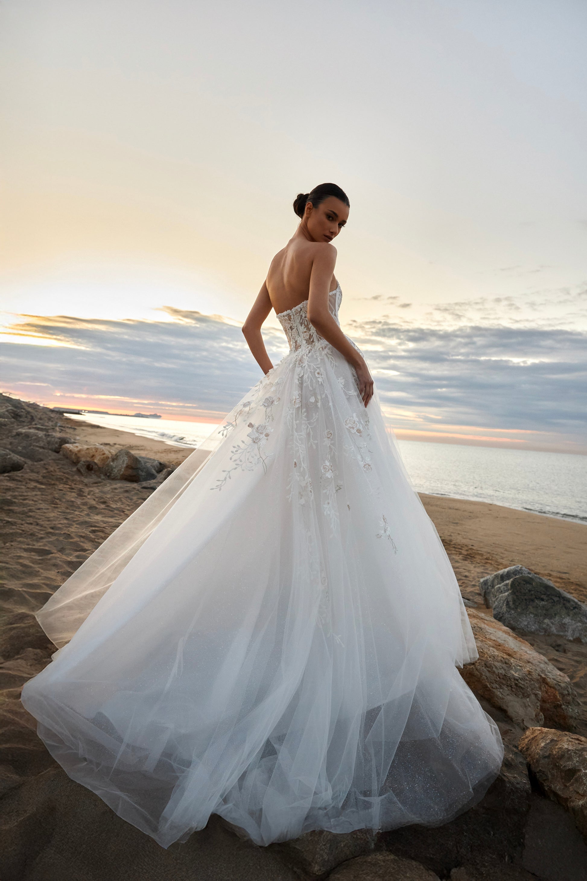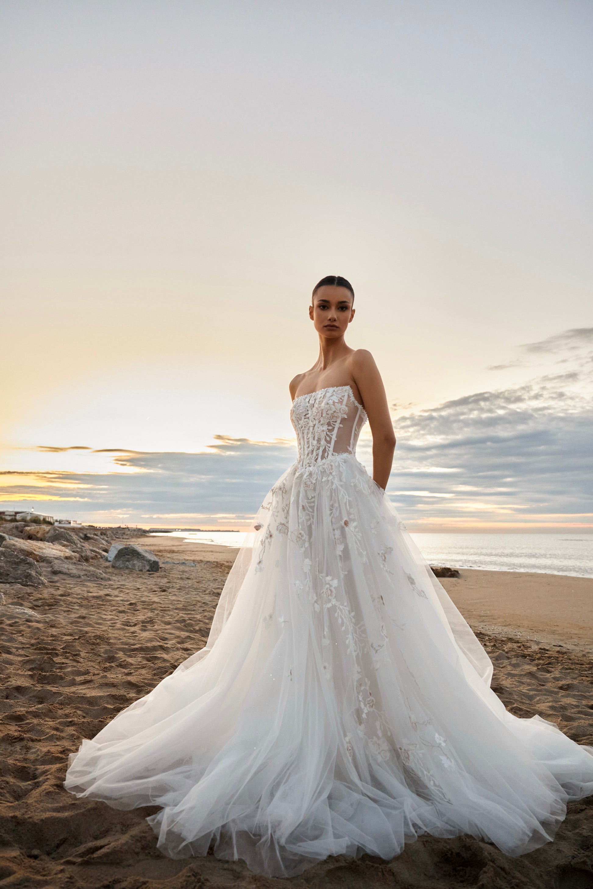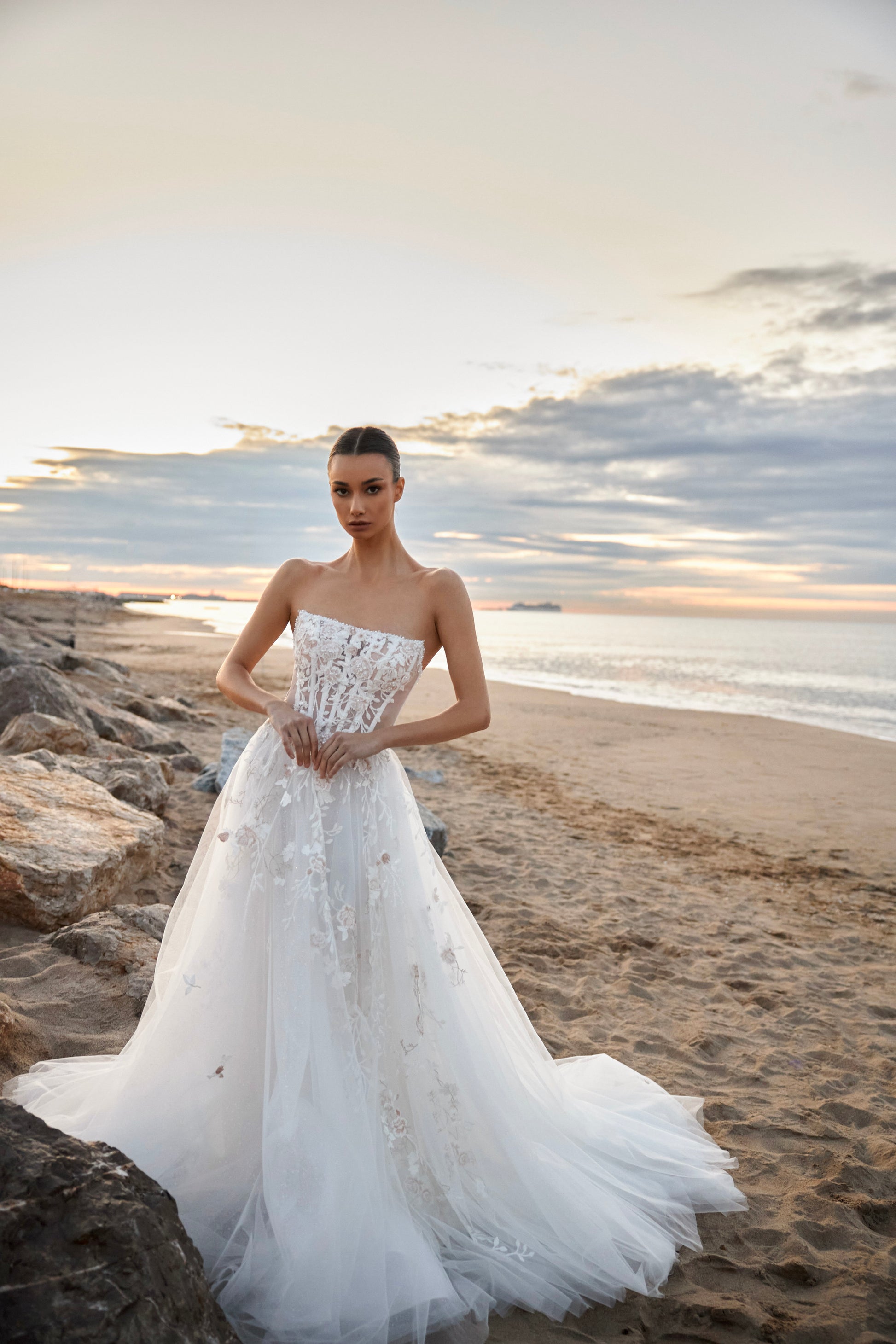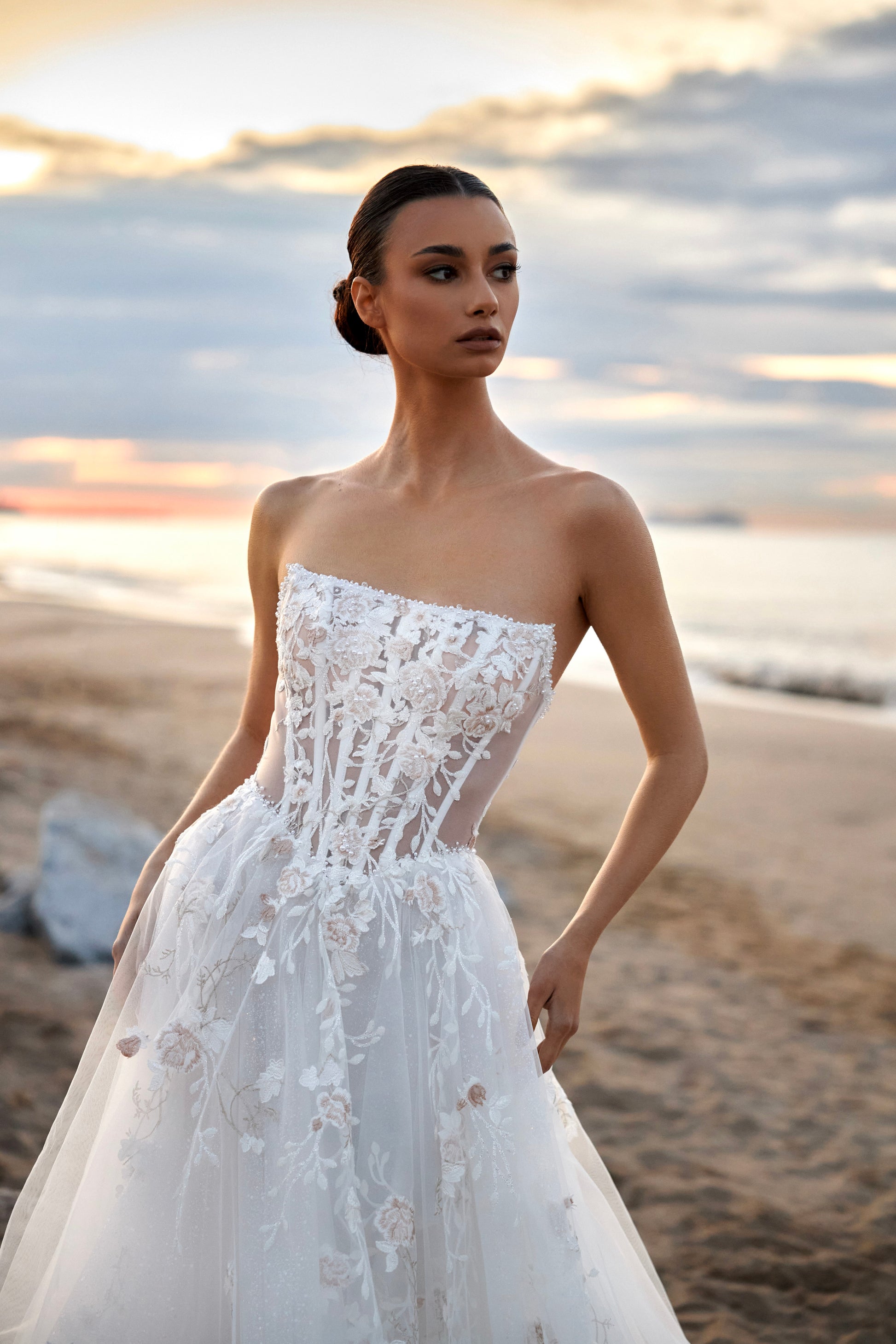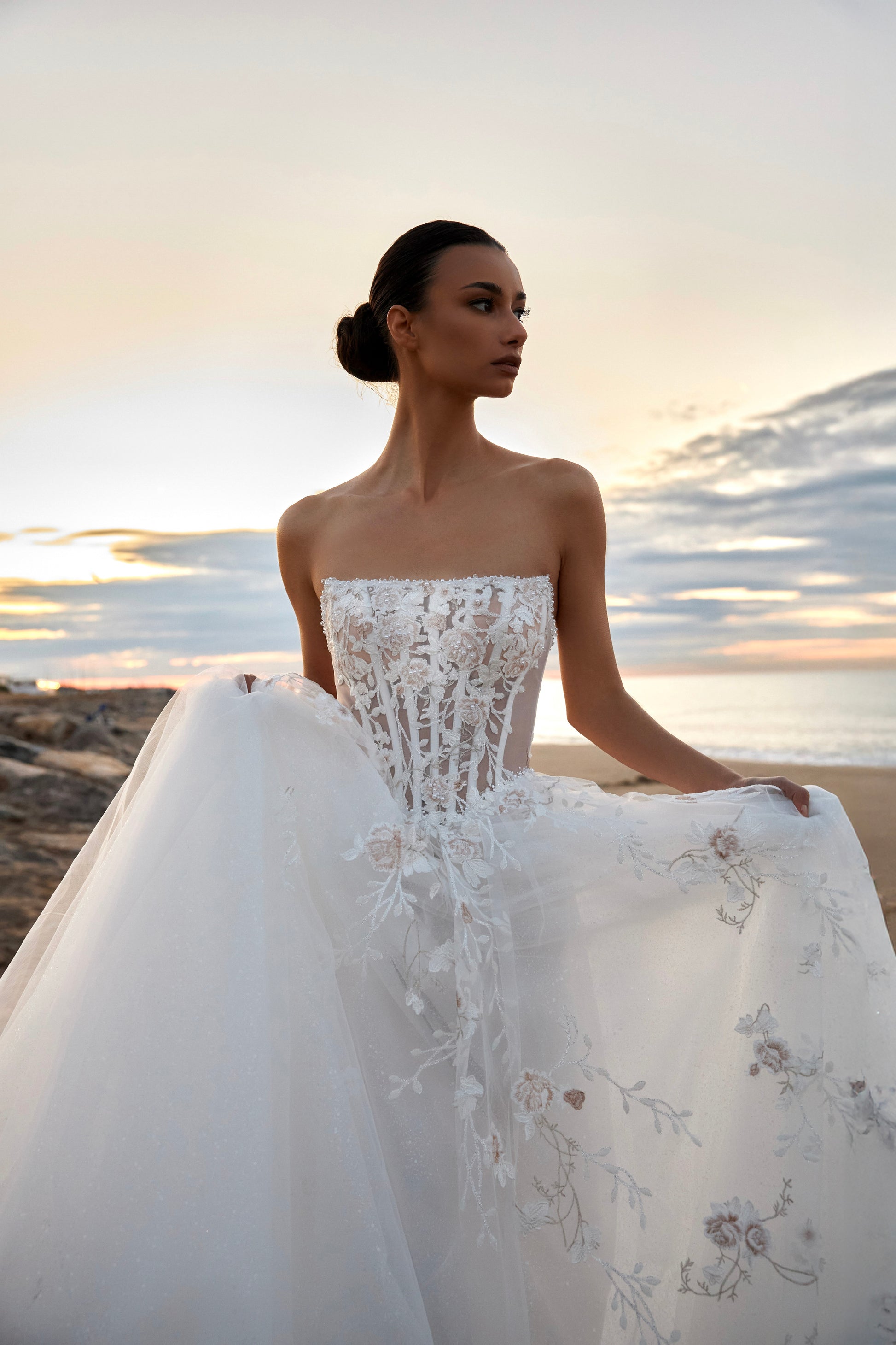 From the creative ateliers of Secret Sposa, a division of the renowned Gabbiano Wedding House, comes Ferretty—a vision of contemporary romance and soft sophistication. This strapless A-line wedding gown pairs architectural structure with delicate botanical artistry, perfect for the modern bride with a poetic soul.