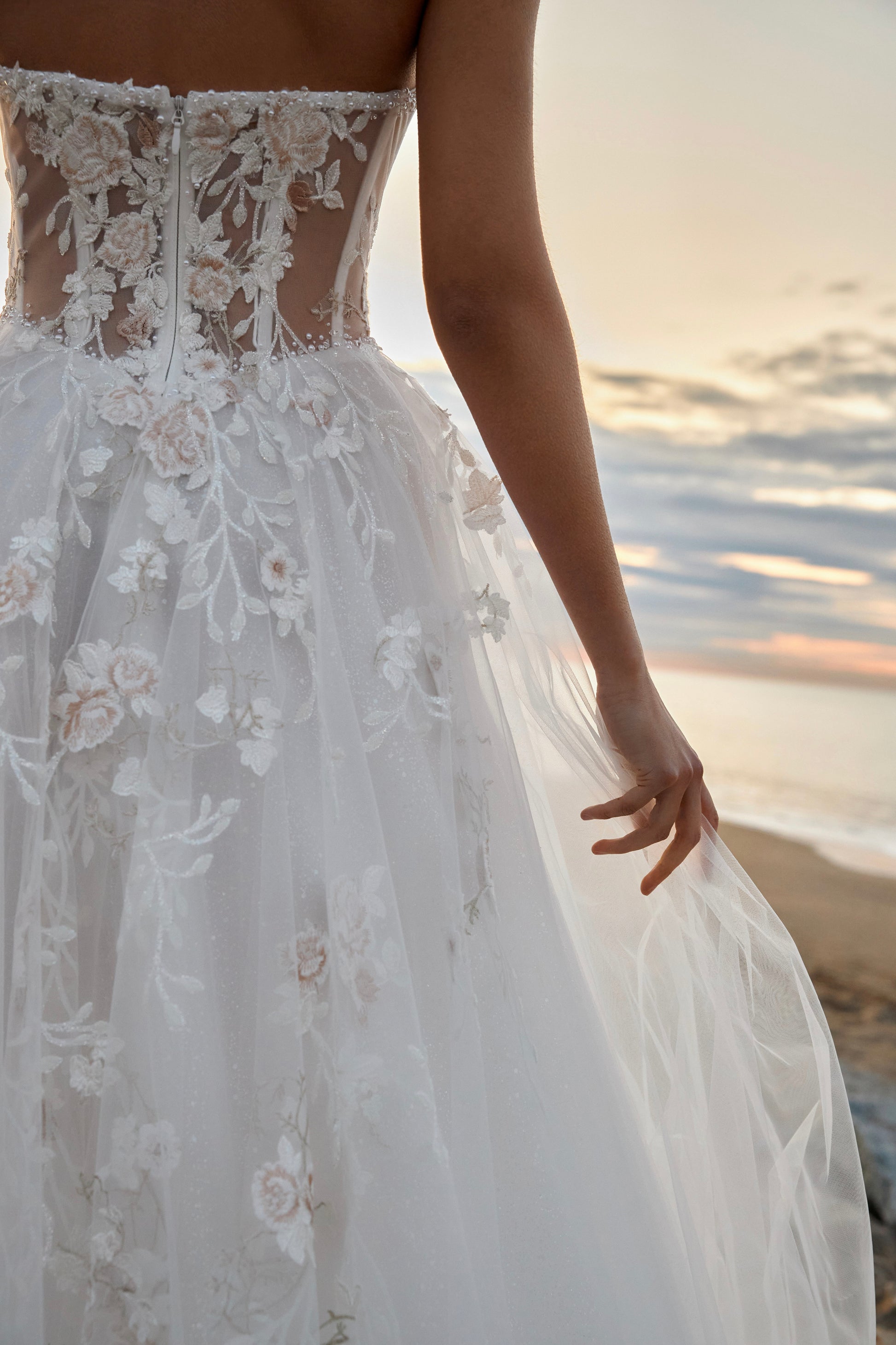 The sheer corset bodice features exposed boning and is adorned with finely embroidered floral appliqués that trail gently into the skirt. Layers of soft tulle create a dreamy, full silhouette that moves with airy lightness, while a dusting of shimmer beneath adds a hint of celestial glow.