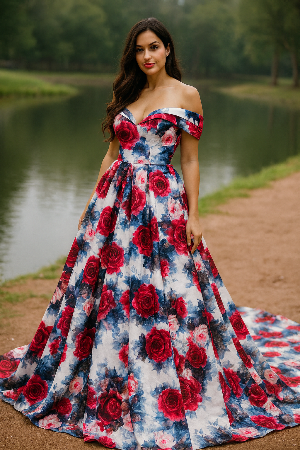 The bodice of the dress is sculpted with a sweetheart neckline that is framed by an off-shoulder design, with sleeves that drape elegantly down the arms, adding a romantic and classic touch. The neckline is adorned with the same bold floral print, which seamlessly transitions into the skirt.