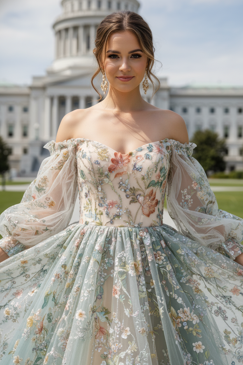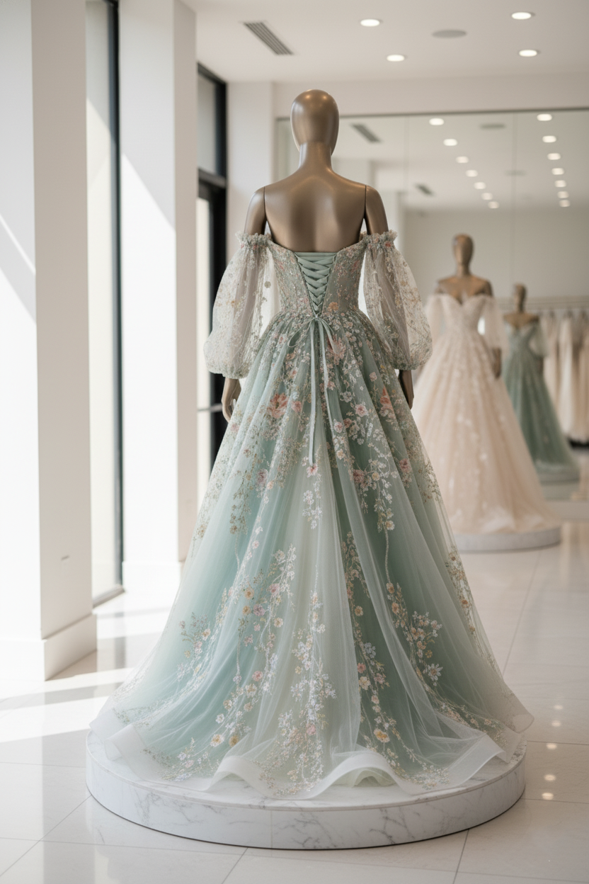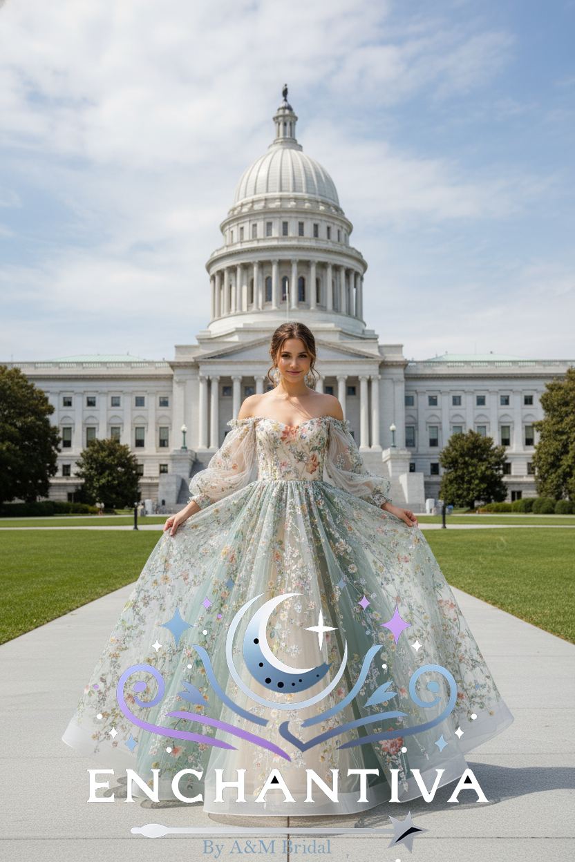 Step into a living garden with Floravine — an Enchantiva original designed for the dreamer who sees beauty in every petal. This breathtaking off-shoulder gown features billowing illusion sleeves, a corseted bodice, and layers of sage-toned tulle delicately embroidered with pastel wildflowers. Every stitch tells a story of renewal and romance, as though the dress itself were blooming under sunlight.