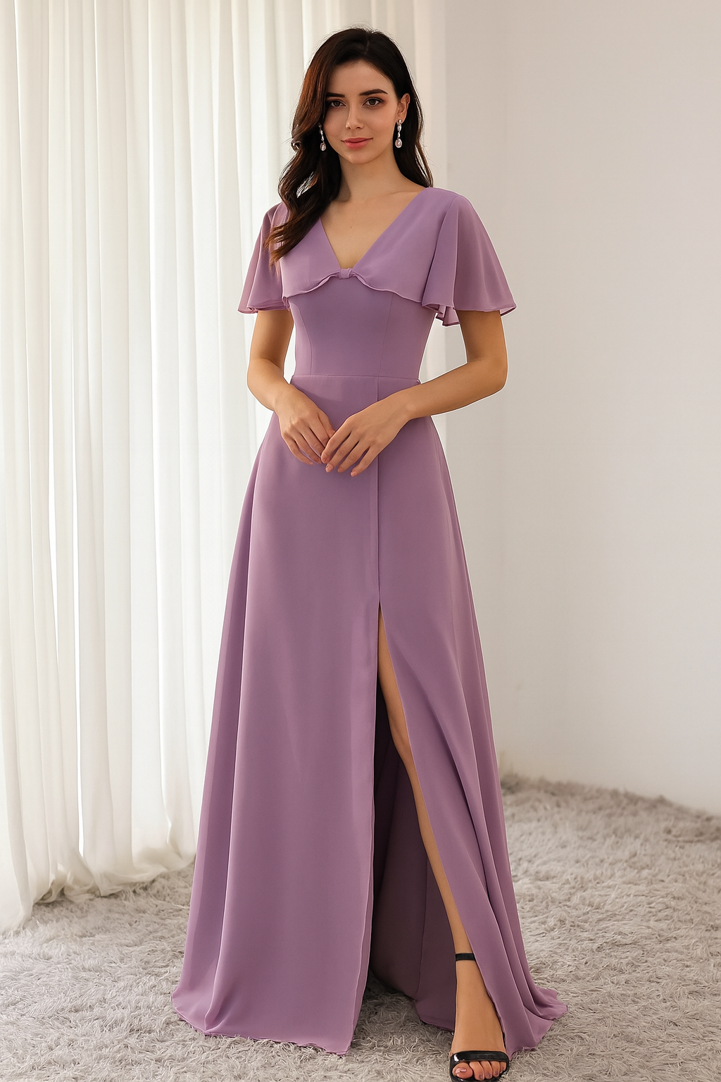 Looking for a sophisticated and timeless bridesmaid dress? This A-line chiffon gown is designed to bring effortless elegance to any bridal party. Featuring soft flutter sleeves, a V-neckline with delicate draping, and a flowing skirt with a subtle front slit, this gown offers the perfect balance of grace and comfort. Plus, it's available in a wide range of colors, making it ideal for any wedding theme!
