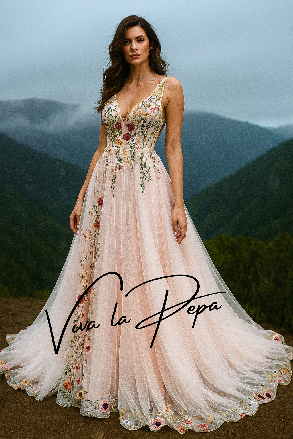 Keywords: floral wedding dress, blush wedding gown, boho wedding dress, unique bridal gown, romantic garden wedding dress, A-line bridal gown, embroidered wedding dress, nature-inspired wedding dress, outdoor wedding gown.