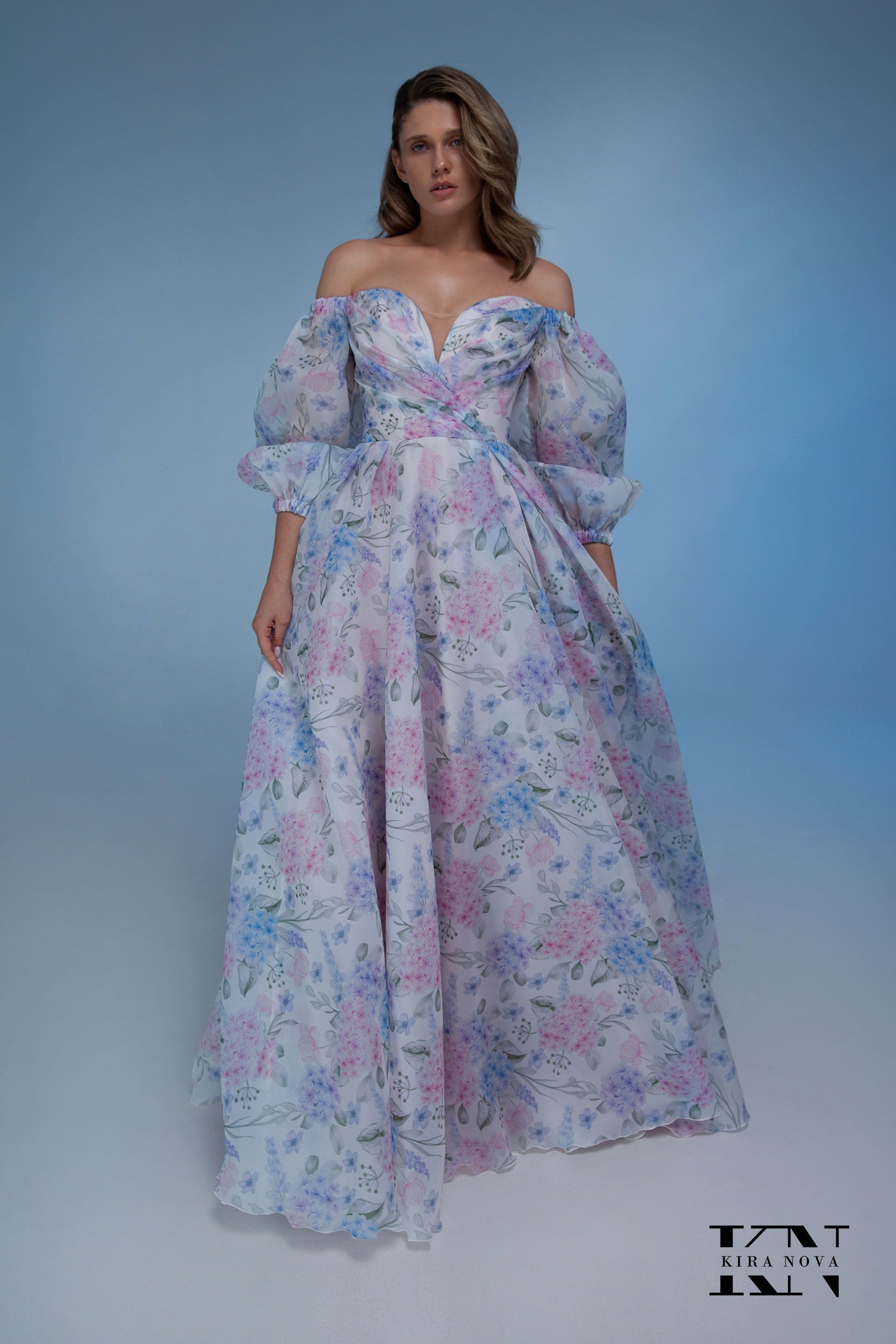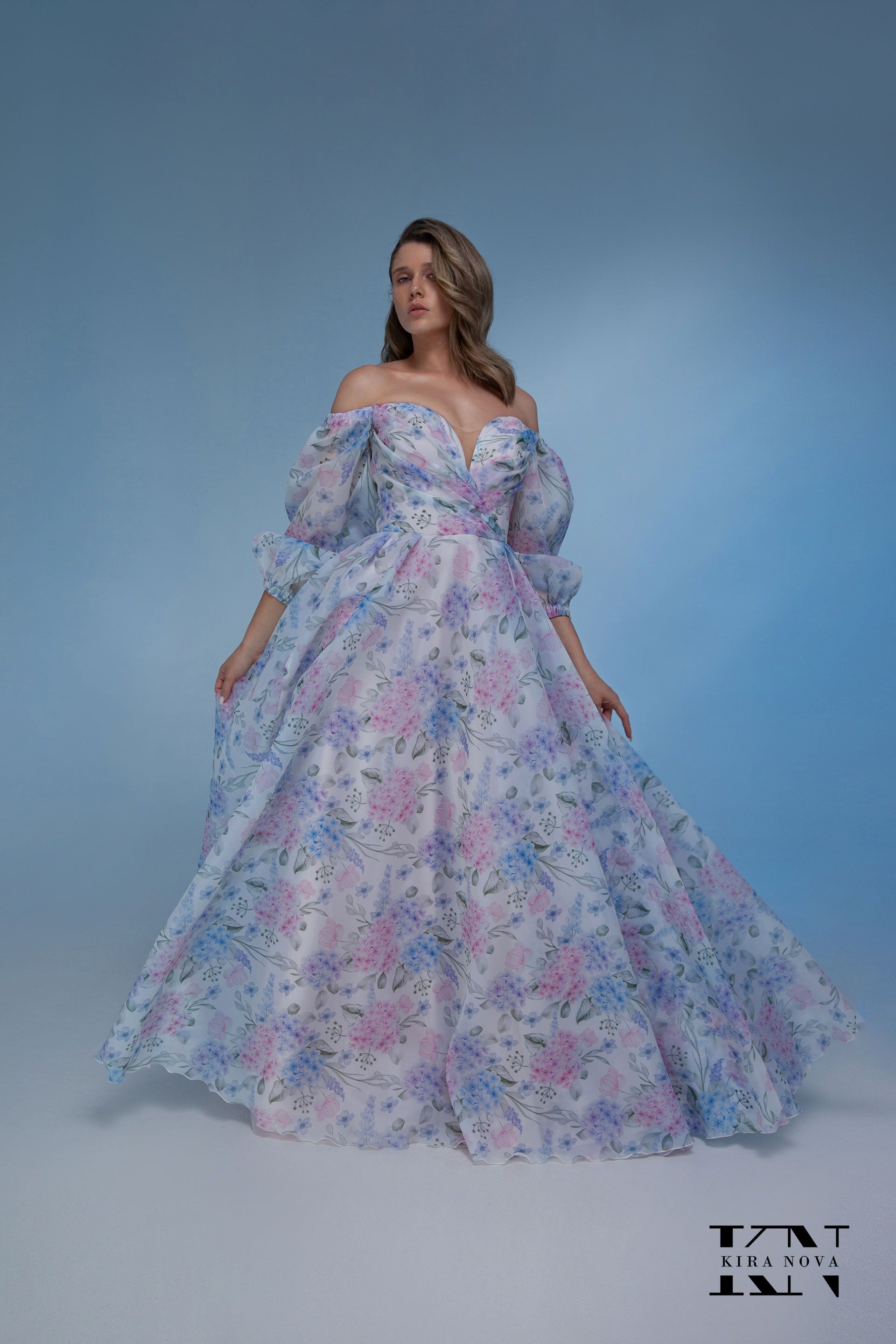 Ginny by Kira Nova – Off-Shoulder Floral Chiffon A-Line Gown