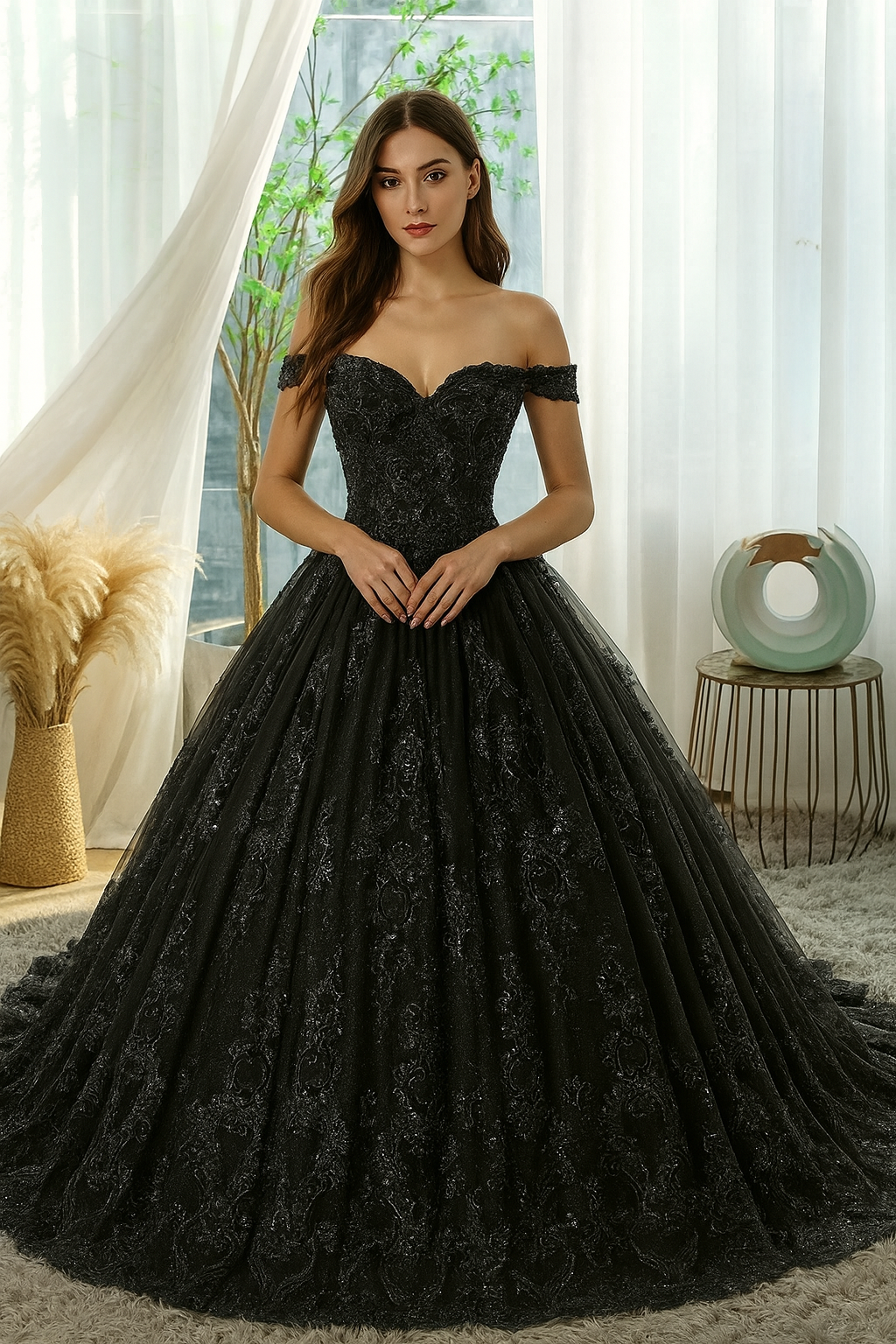Make a statement in the Anoki gown, a breathtaking emerald green ball gown designed for those who love timeless elegance with a touch of drama. Crafted from layers of luxurious tulle, this off-the-shoulder dress features a fitted sweetheart bodice, encrusted with intricate lace appliqué and shimmering sequins for a dazzling effect.