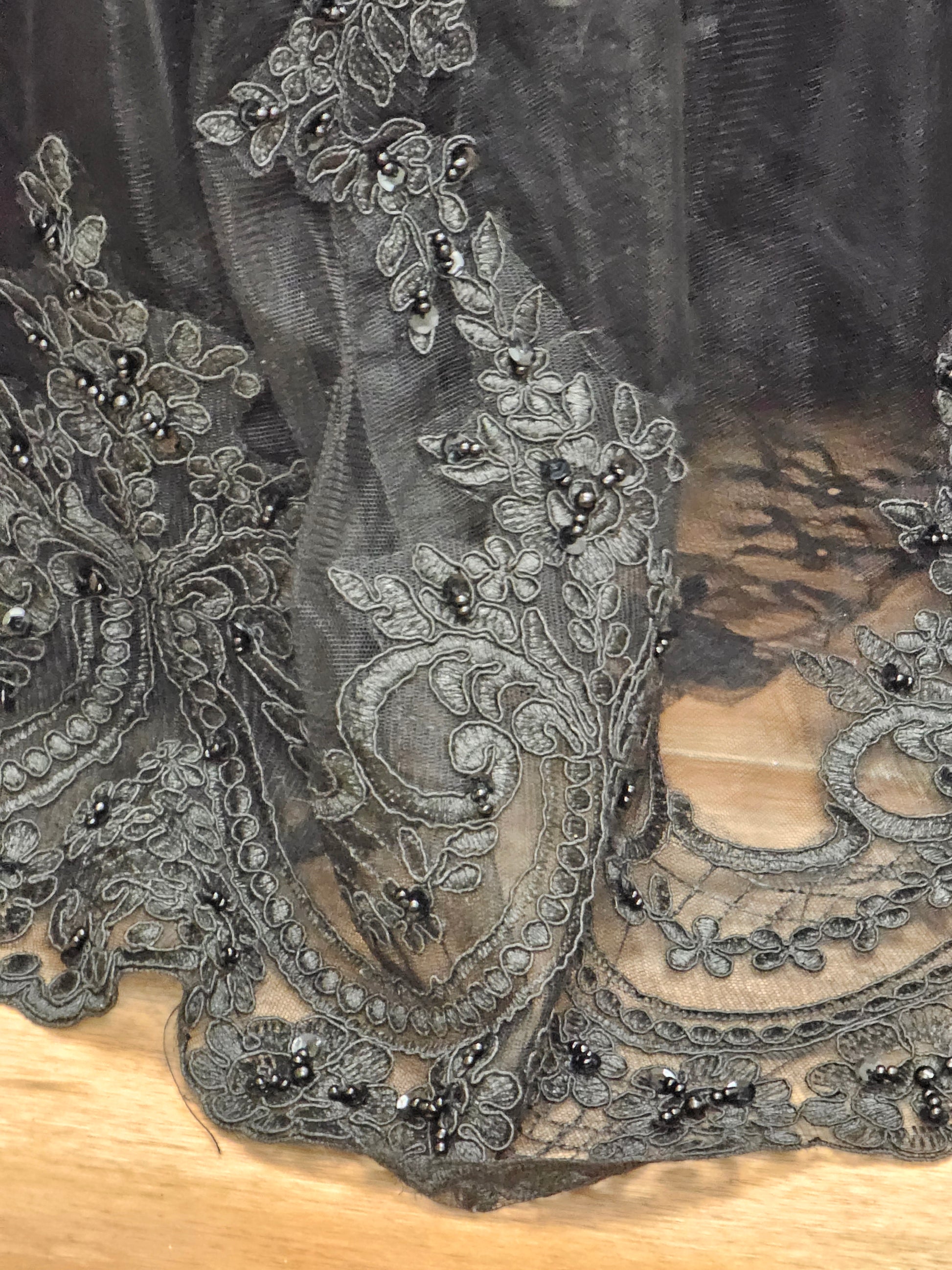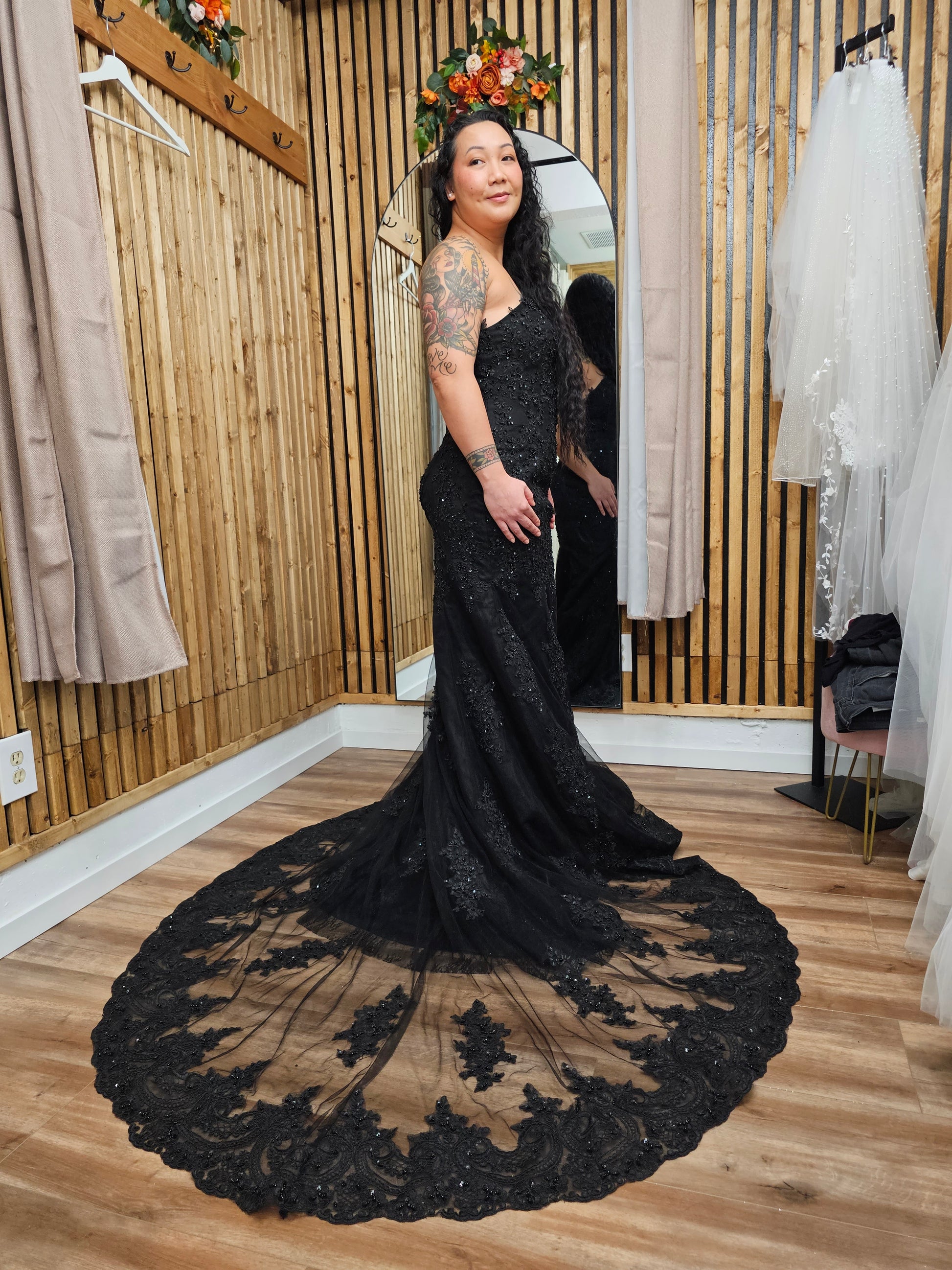 The Thalassa features intricate black lace appliqués that cascade over the fabric, creating a dramatic and luxurious effect. The black and green version highlights a rich ombré effect, while the all-black option exudes timeless sophistication and mystery. The fitted silhouette enhances your curves beautifully, and the dramatic lace-detailed train adds a regal and unforgettable touch to your bridal look.