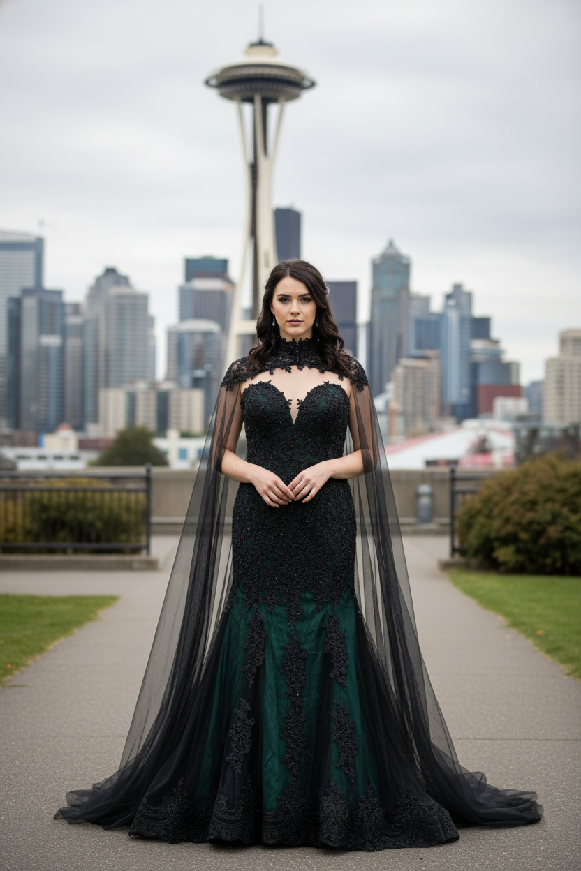 Designed with versatility, the gown includes a detachable high-neck cape for a second glamorous style, ideal for making a dramatic entrance. The lace-up corset back not only adds vintage charm but also ensures a perfectly customizable fit. Whether you’re planning a gothic, fantasy, or unconventional wedding, the Thalassa is crafted to make you stand out on your special day.