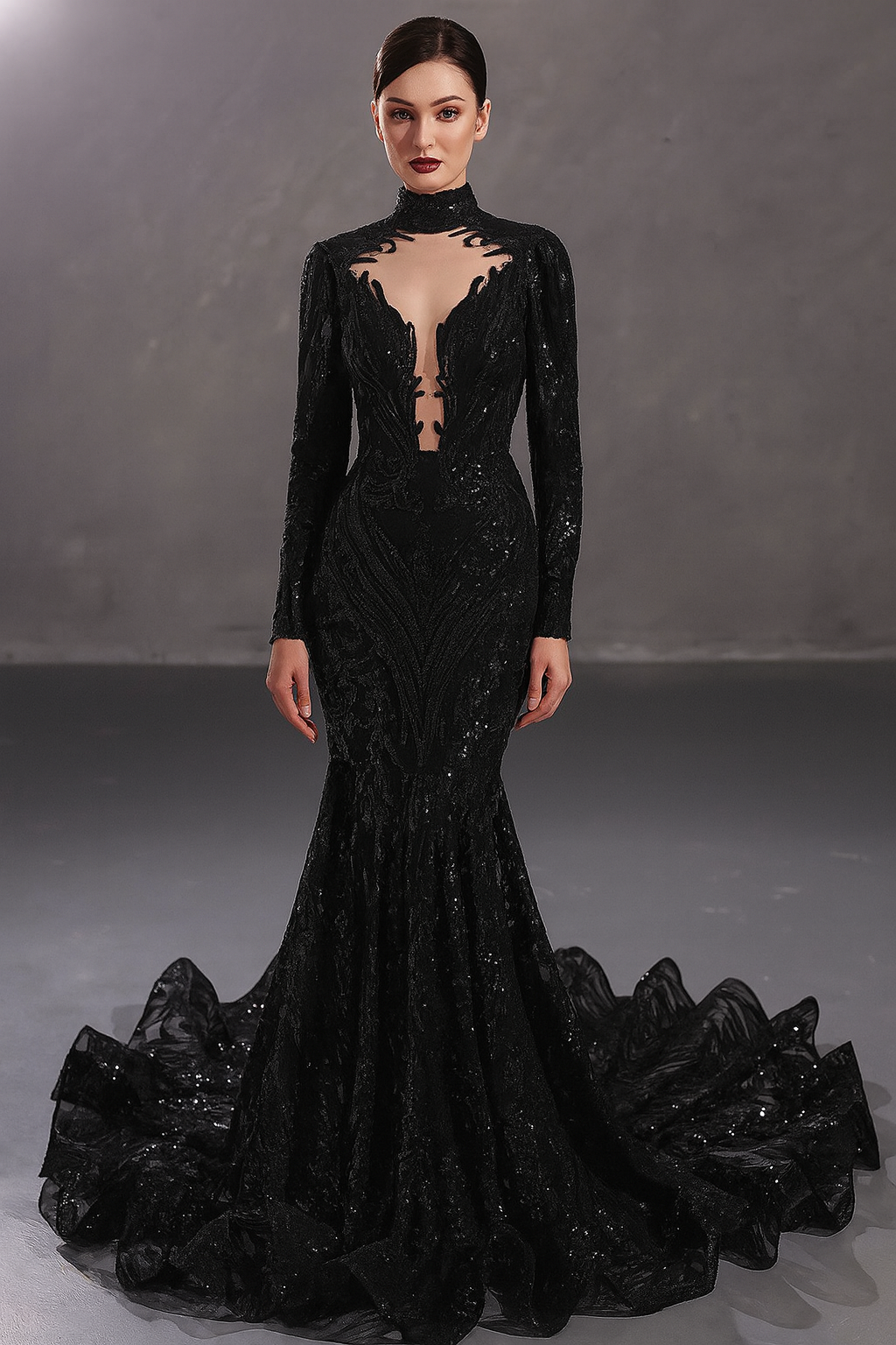 Step into a world of dark elegance with the “Tish” wedding gown, a masterpiece of gothic sophistication and dramatic allure. This captivating black sequin lace gown features a striking high neckline with intricate cutout detailing that frames the décolletage in mesmerizing artistry. Long fitted sleeves balance the daring bodice, flowing into a sleek mermaid silhouette that flares into a breathtaking lace train. Ideal for gothic weddings, black-tie events, or brides seeking an unforgettable statement piece, Tish delivers timeless glamour with an edgy, modern twist.