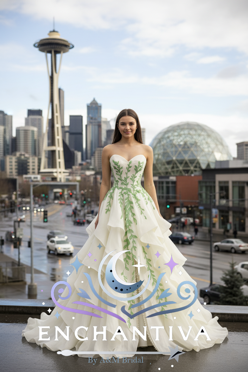 Photographed in Seattle against the iconic Space Needle, Hapa Tsuru shines as a gown meant for brides who want their dress to feel like a story—organic, artistic, and deeply personal.