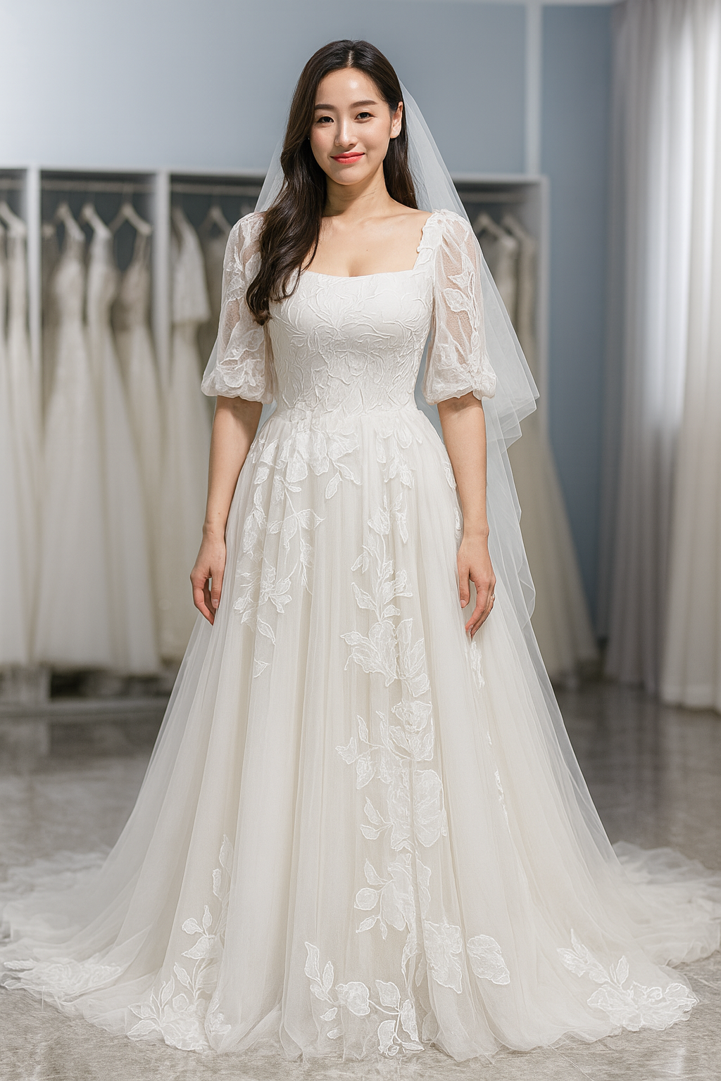 The Harper Wedding Dress is a timelessly elegant choice for brides seeking a modest yet romantic bridal look. Designed with a high neckline, covered back with delicate buttons, and flowing A-line silhouette, Harper exudes classic sophistication. The soft puff sleeves and intricate floral lace appliqués add a dreamy touch, while the long train ensures a breathtaking walk down the aisle. Perfect for modest, vintage, garden, and romantic weddings, this gown offers both elegance and coverage without compromising on beauty.