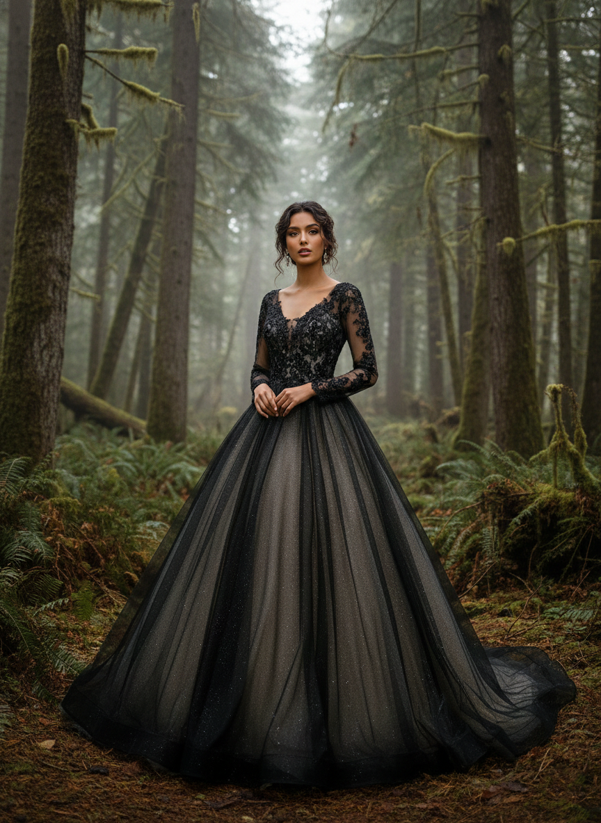 🖤 Hunter – Black Lace Ball Gown Wedding Dress with Long Sleeves