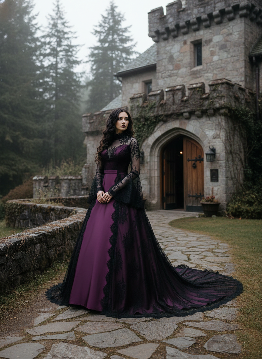 Jocelyne is a vintage-inspired Gothic ball gown that blends black drama with deep purple allure. Designed with a structured bodice, illusion lace neckline, and flowing bell sleeves, this gown evokes timeless elegance with a dark romantic edge.