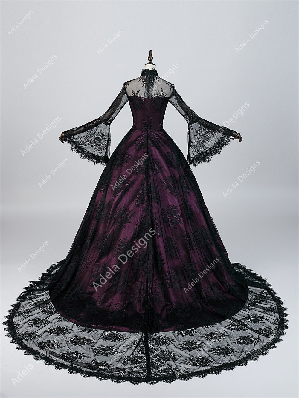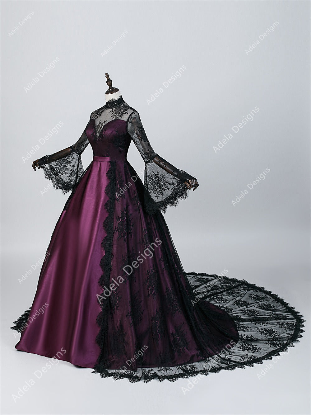 Layers of black lace cascade over rich grape purple satin, creating a bold contrast that adds depth and movement to the full ball gown skirt. Intricate lace detailing highlights the bodice and trails into the skirt, while the bell sleeves introduce a soft, nostalgic silhouette reminiscent of antique romance.