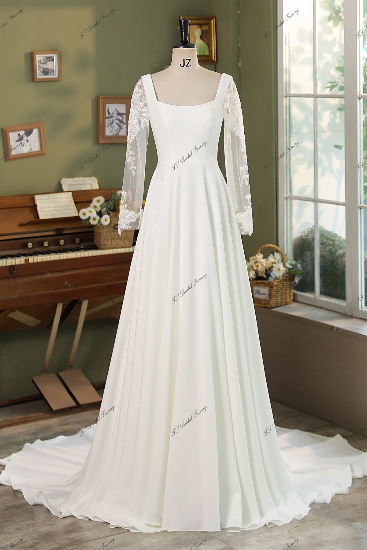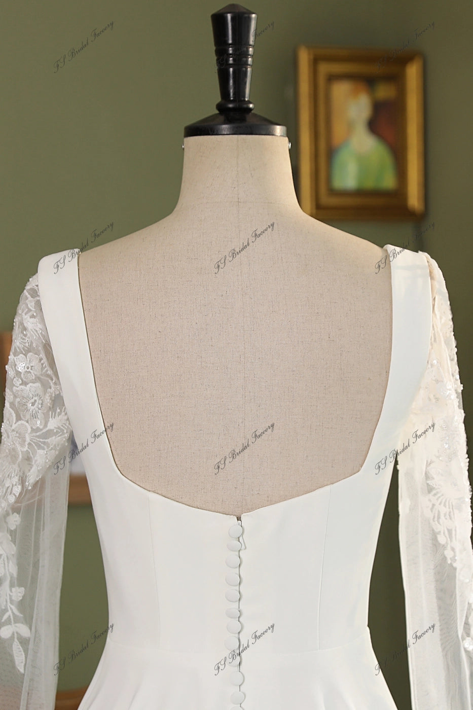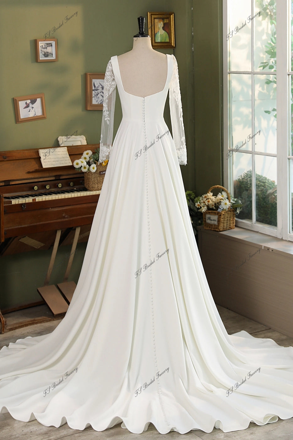 Kaydence Crepe Wedding Dress – Square Neck A-Line Gown with Detachable Lace Sleeves and Chapel Train