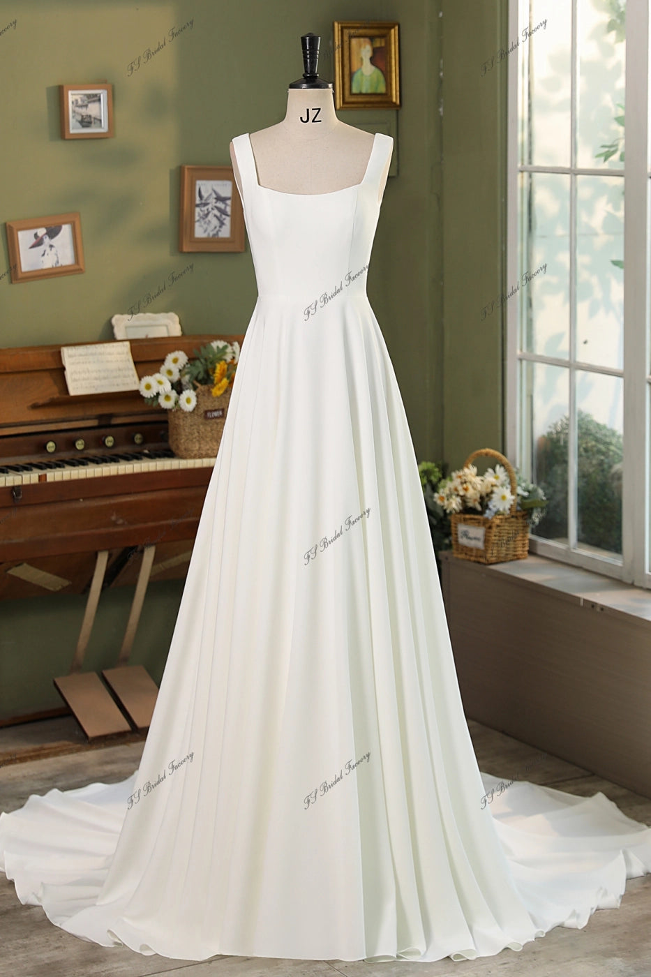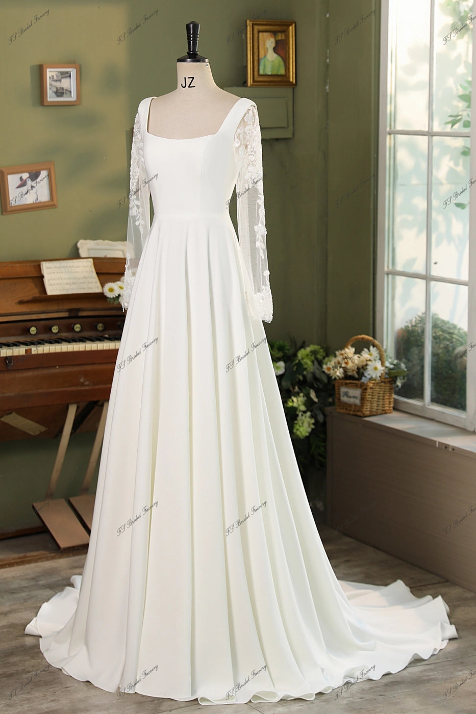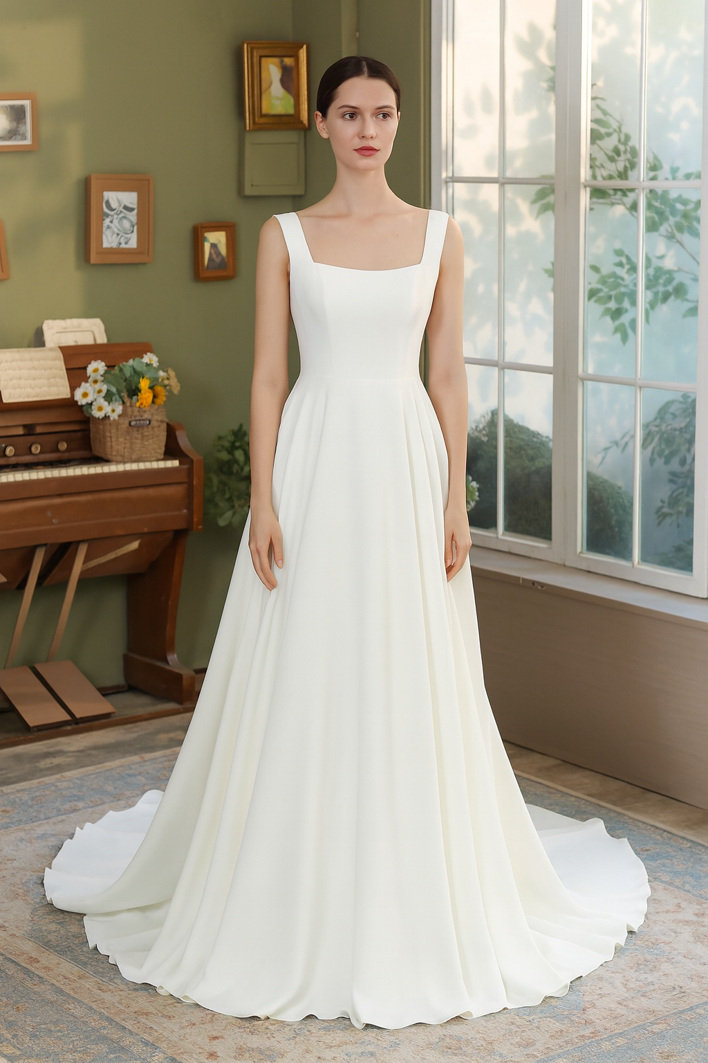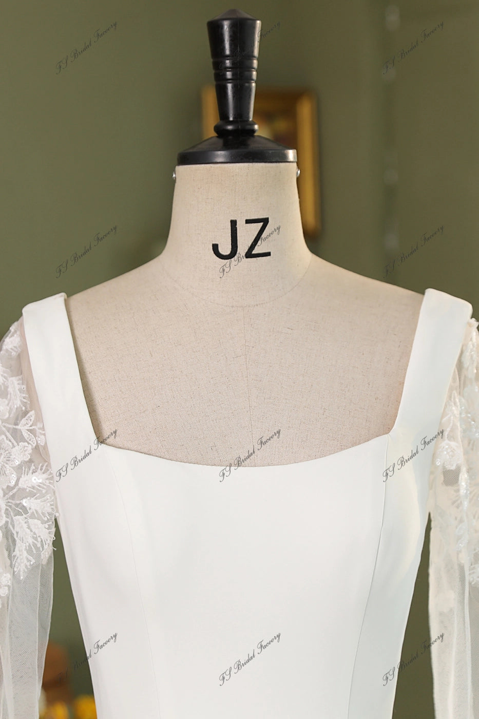 Kaydence Crepe Wedding Dress – Square Neck A-Line Gown with Detachable Lace Sleeves and Chapel Train