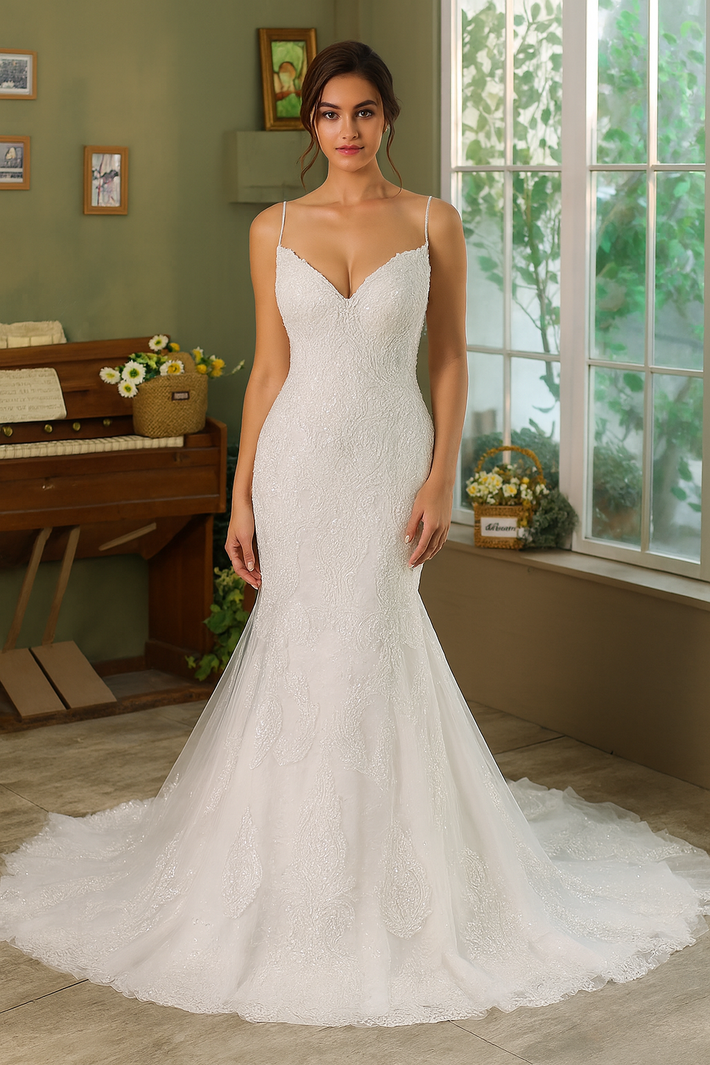 Make a breathtaking entrance in the Keely wedding gown, a stunning mermaid silhouette that exudes elegance and timeless romance. Featuring a delicate sweetheart neckline with thin spaghetti straps, this gown hugs your curves before flaring into a dramatic tulle train adorned with intricate lace appliqués. The shimmering hand-beaded embellishments catch the light beautifully, creating an ethereal glow. A corset-style lace-up back ensures the perfect fit, making this gown ideal for modern brides seeking a touch of classic glamour.