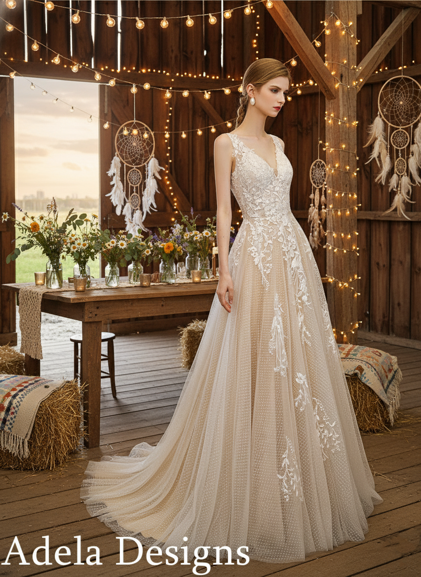 Boho, rustic, or romantic brides seeking a lightweight yet detailed gown that combines comfort, movement, and ethereal charm. Perfect for garden weddings, vineyard ceremonies, or outdoor receptions.