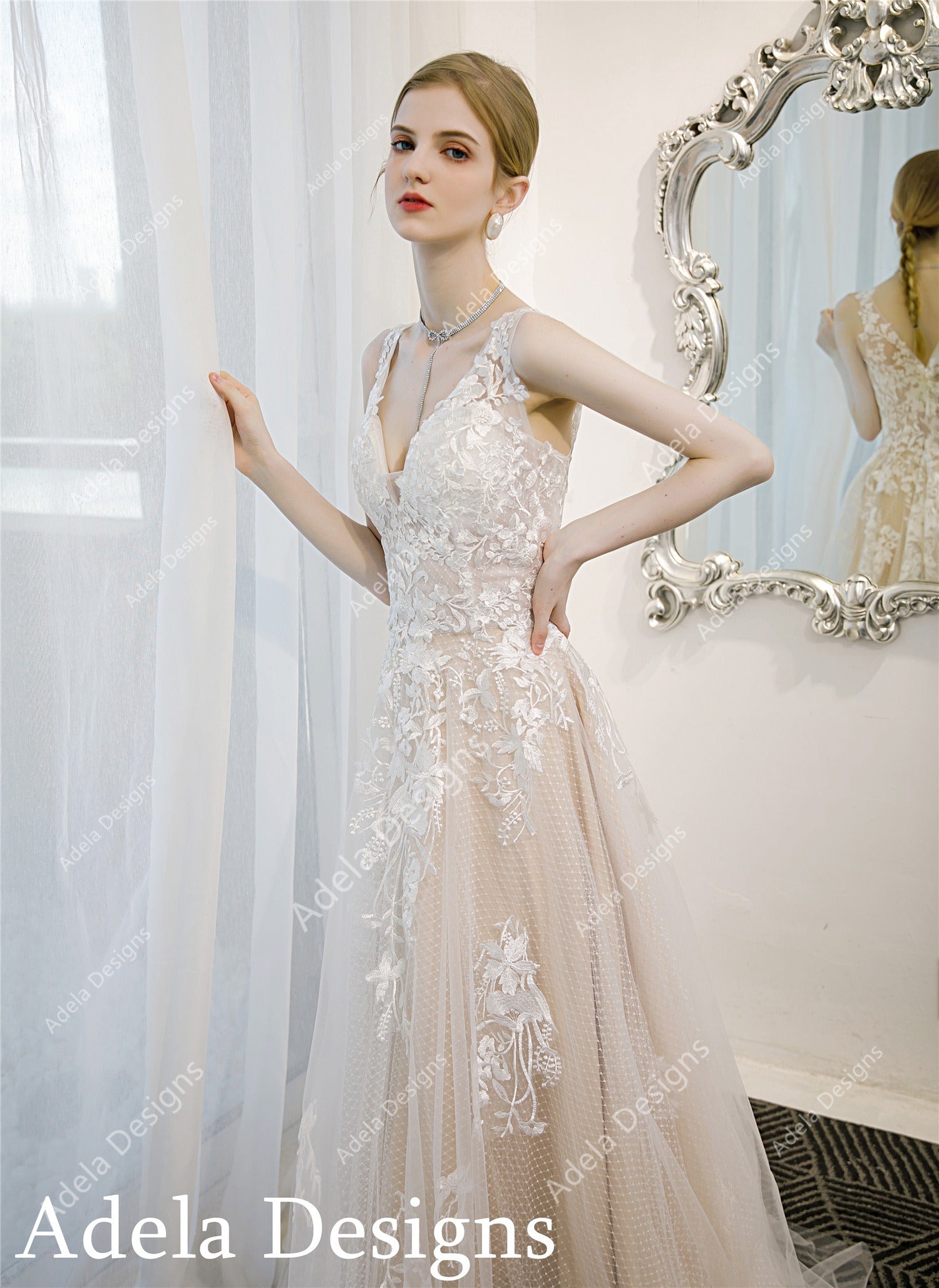 The Kodi gown by Adela Designs blends modern romance with effortless boho charm. Designed for the free-spirited bride, this A-line silhouette features a soft champagne underlay topped with ivory floral lace appliqués, creating a stunning depth of color and texture that flatters every skin tone.