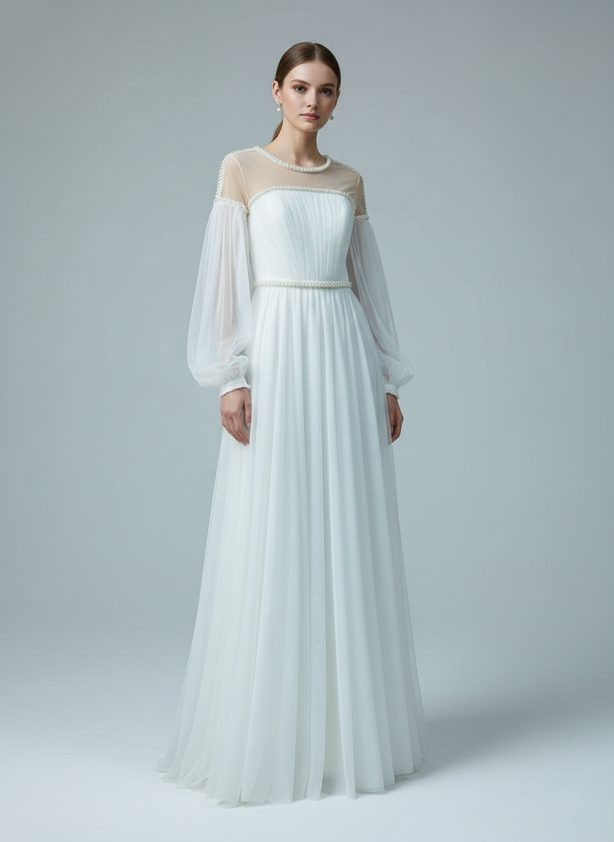 The bodice features a graceful off-the-shoulder neckline, highlighted by a delicate illusion panel that creates a soft, floating effect. Billowing bishop sleeves add a touch of drama, while pearl-trim accents create an elevated, couture-inspired finish around the neckline, waist, and sleeve cuffs.