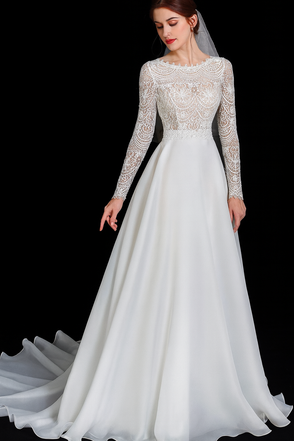 Figure-skimming lace base; overskirt creates classic A-line fullness