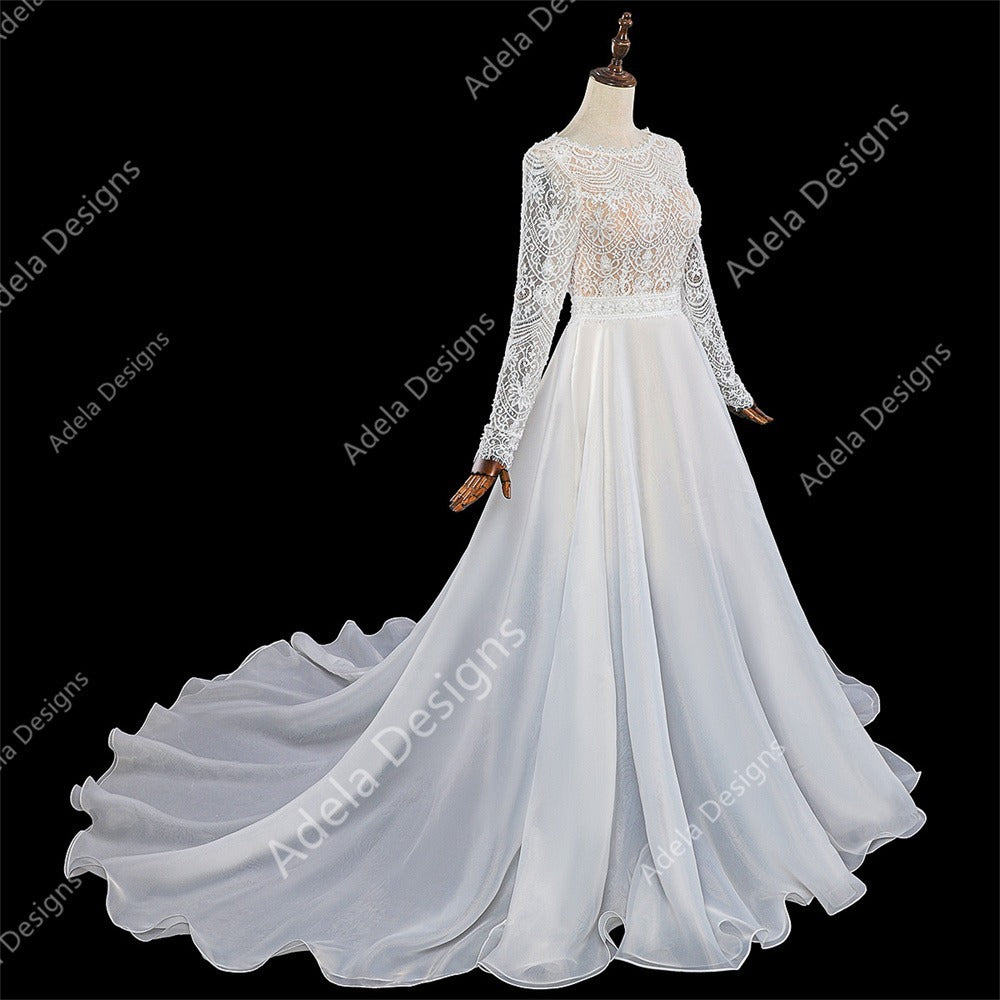 Meet Marthe by Adela Designs—a dreamy, two-in-one gown for the modern romantic. Slip into the fitted all-lace dress with long sleeves for an effortlessly boho vibe, then float down the aisle with the detachable, sweeping overskirt for full-length drama. After “I do,” remove the skirt for a chic reception look you can dance in all night.