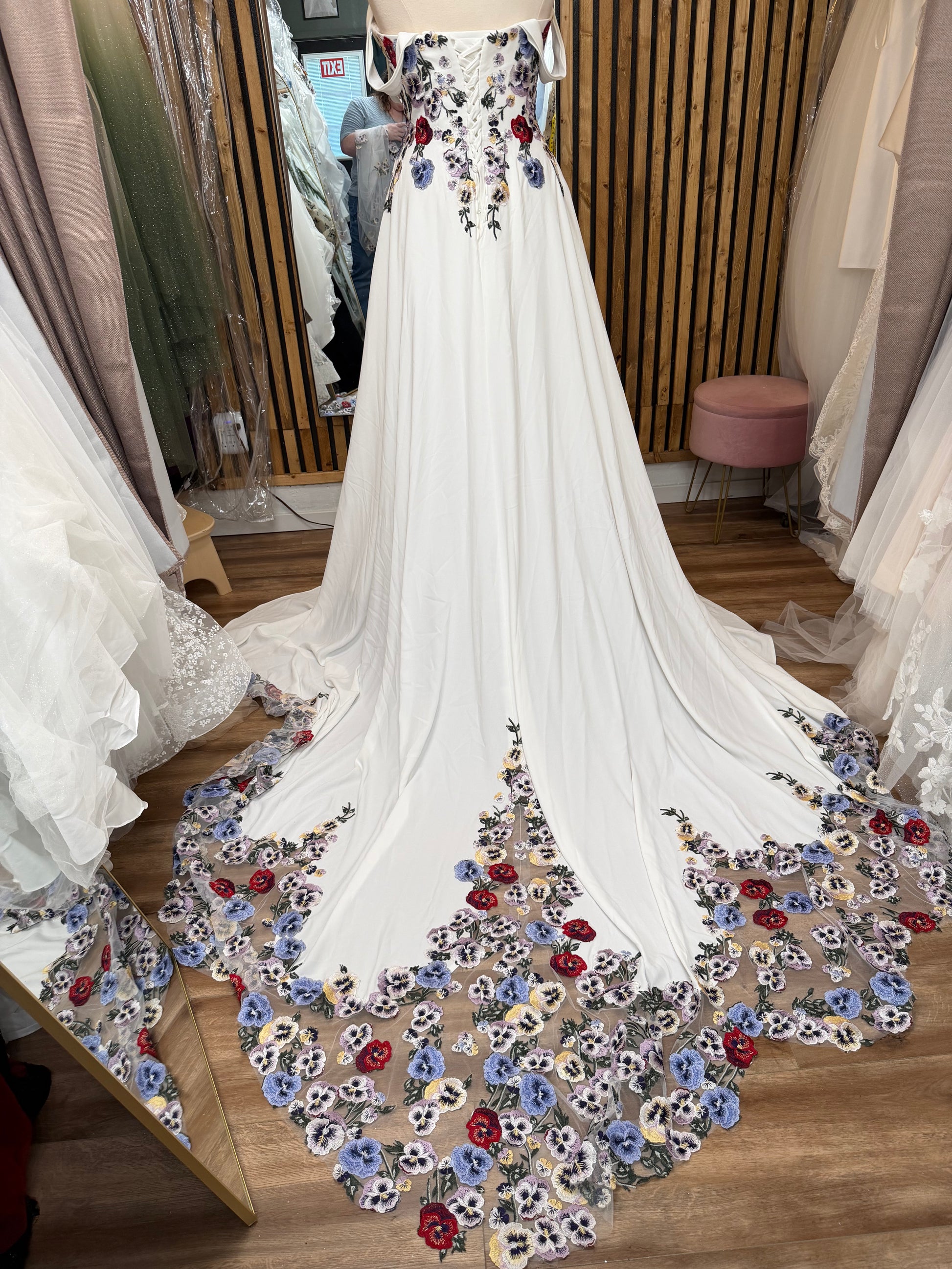 What truly sets Meadow Dream apart is its breathtaking botanical embroidery. Hand-applied floral appliqués cascade down the bodice and trail dramatically into the sheer tulle train, featuring soft lavender, dusty blue, muted ivory, and subtle hints of deep rose. The floral embroidery frames the hemline beautifully, giving the gown an ethereal, garden-inspired finish from every angle.