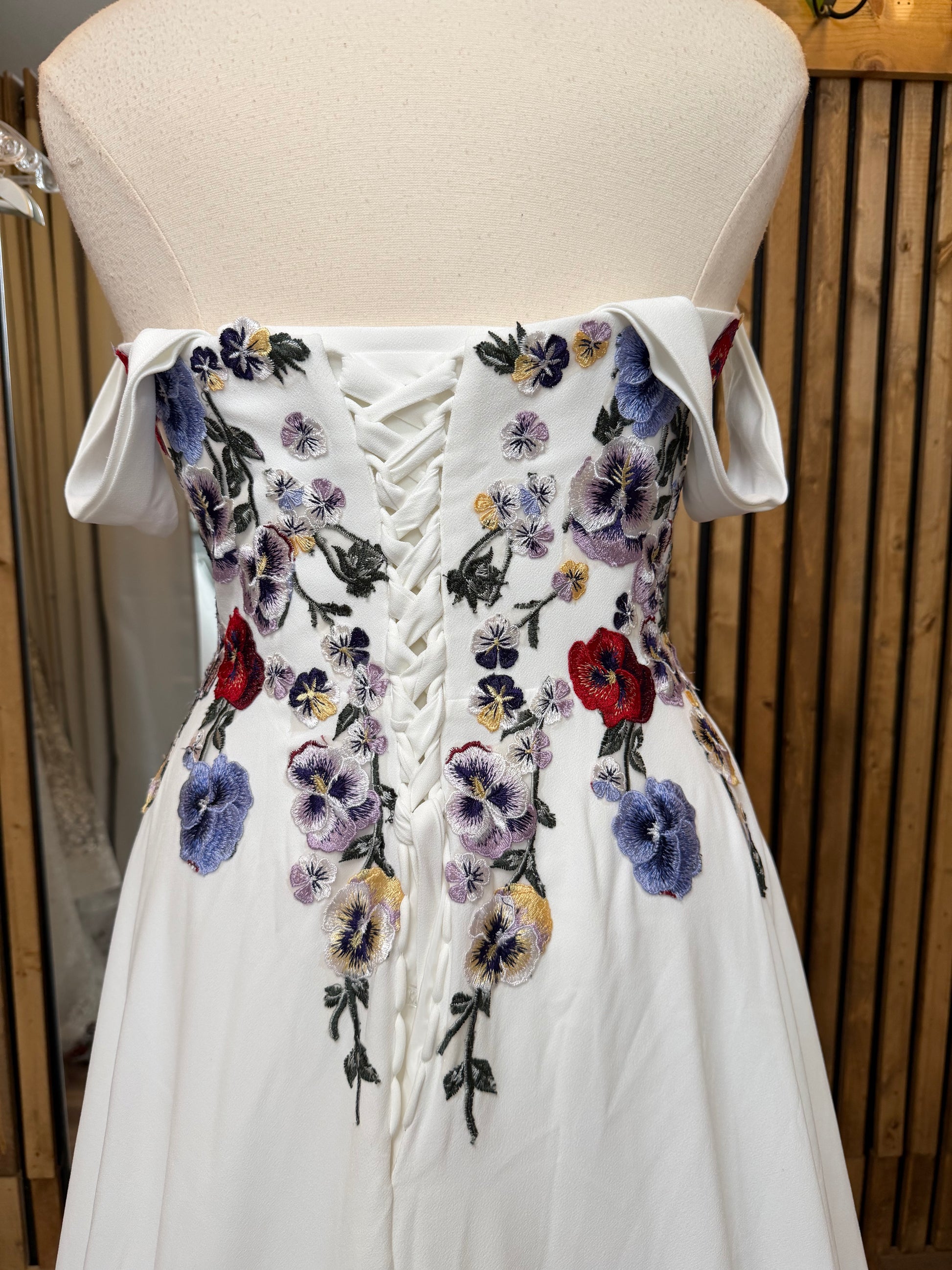 The structured corset bodice offers gentle support while shaping the waist, finished with a lace-up back that allows for adjustability and a custom-feel fit. Soft off-the-shoulder straps drape effortlessly across the arms, creating a flattering neckline that feels both timeless and relaxed.