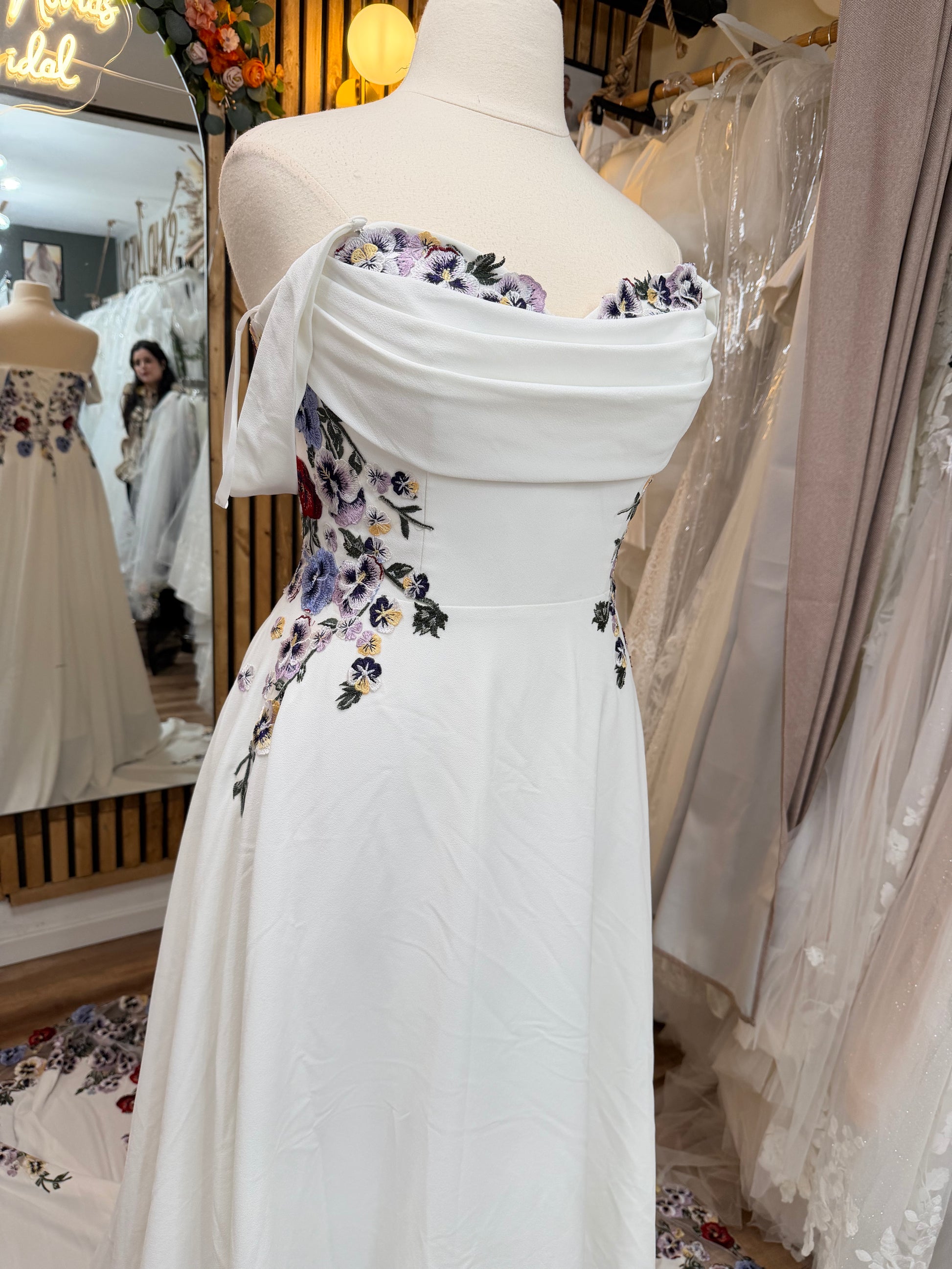 Meadow Dream is a romantic floral wedding dress designed for brides who want something soft, whimsical, and quietly unforgettable. From the first glance, this off-the-shoulder wedding gown feels like a walk through a wildflower meadow—delicate, organic, and full of movement.