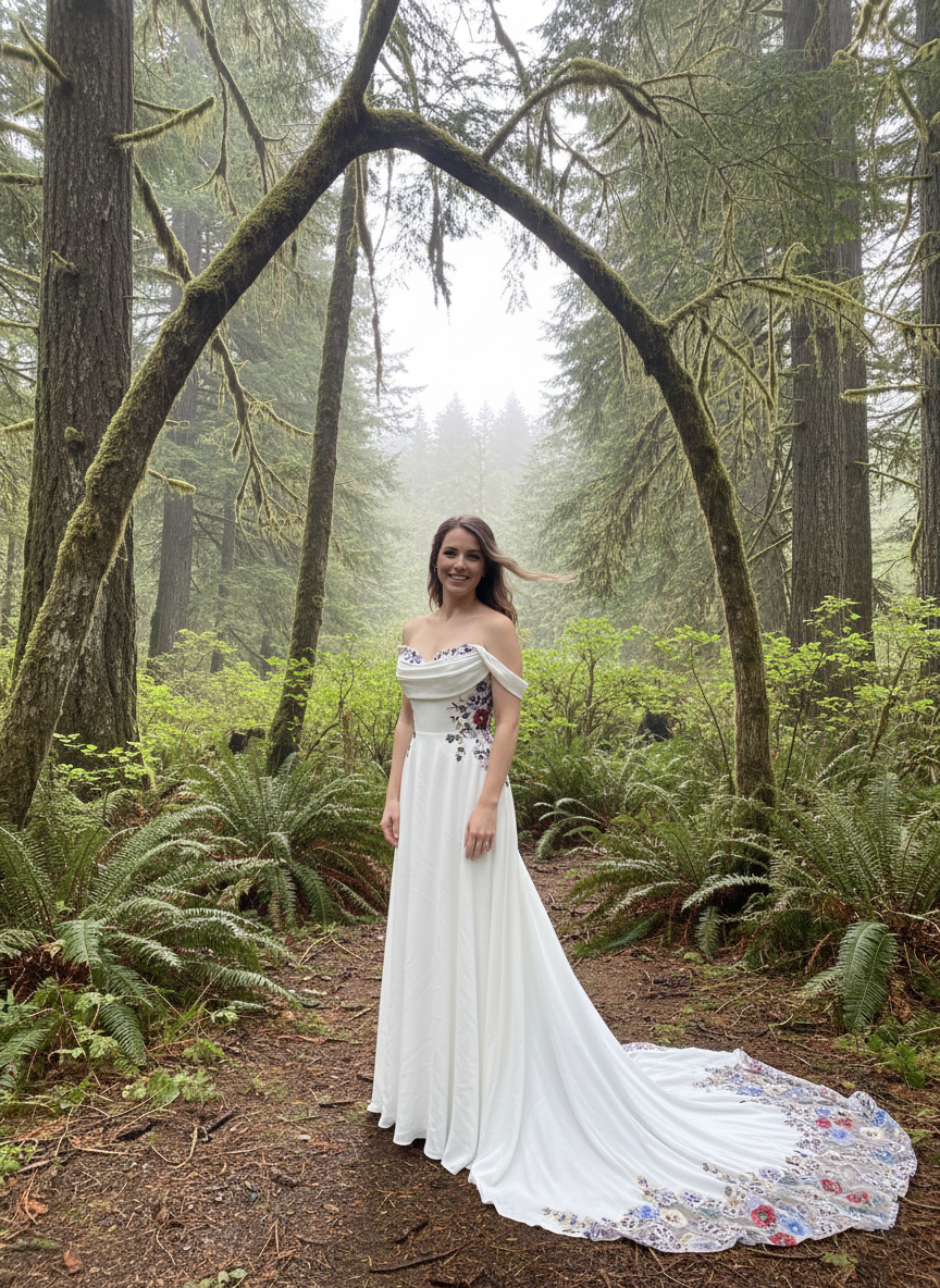 Off-the-Shoulder Botanical Bridal Gown with Embroidered Train