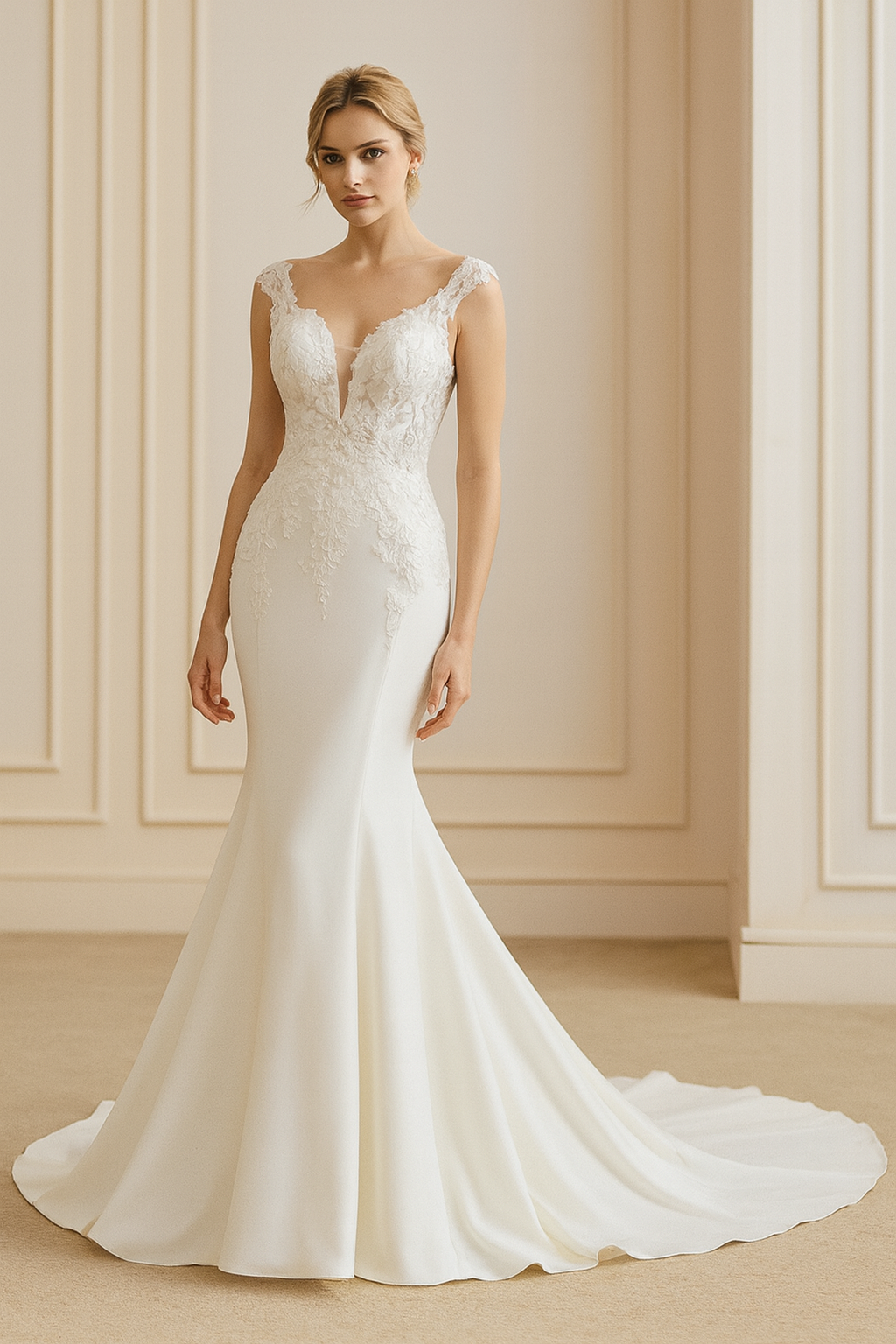 Meet “Eve,” a breathtaking crepe wedding gown that blends modern simplicity with timeless romance. This sleek fit-and-flare dress features a delicately sculpted lace bodice with intricate appliqués that trail effortlessly over the hips, enhancing your natural silhouette. The illusion neckline with a soft plunge adds just a touch of allure, while the luxurious crepe skirt drapes beautifully into a flowing train. Ideal for contemporary weddings, garden ceremonies, or any bride who dreams of minimalist elegance, Eve ensures a look that’s both sophisticated and unforgettable.