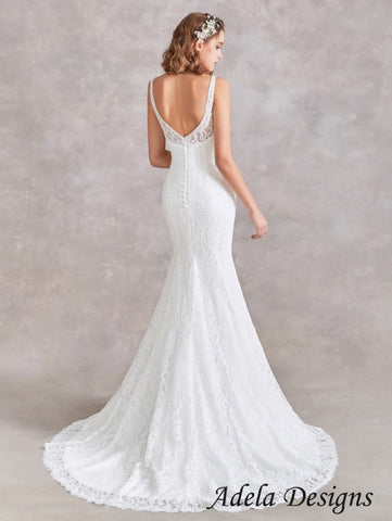 This mermaid lace wedding dress is designed with beaded V-neck, buttons back. The scalloped lace trim completes the look.
