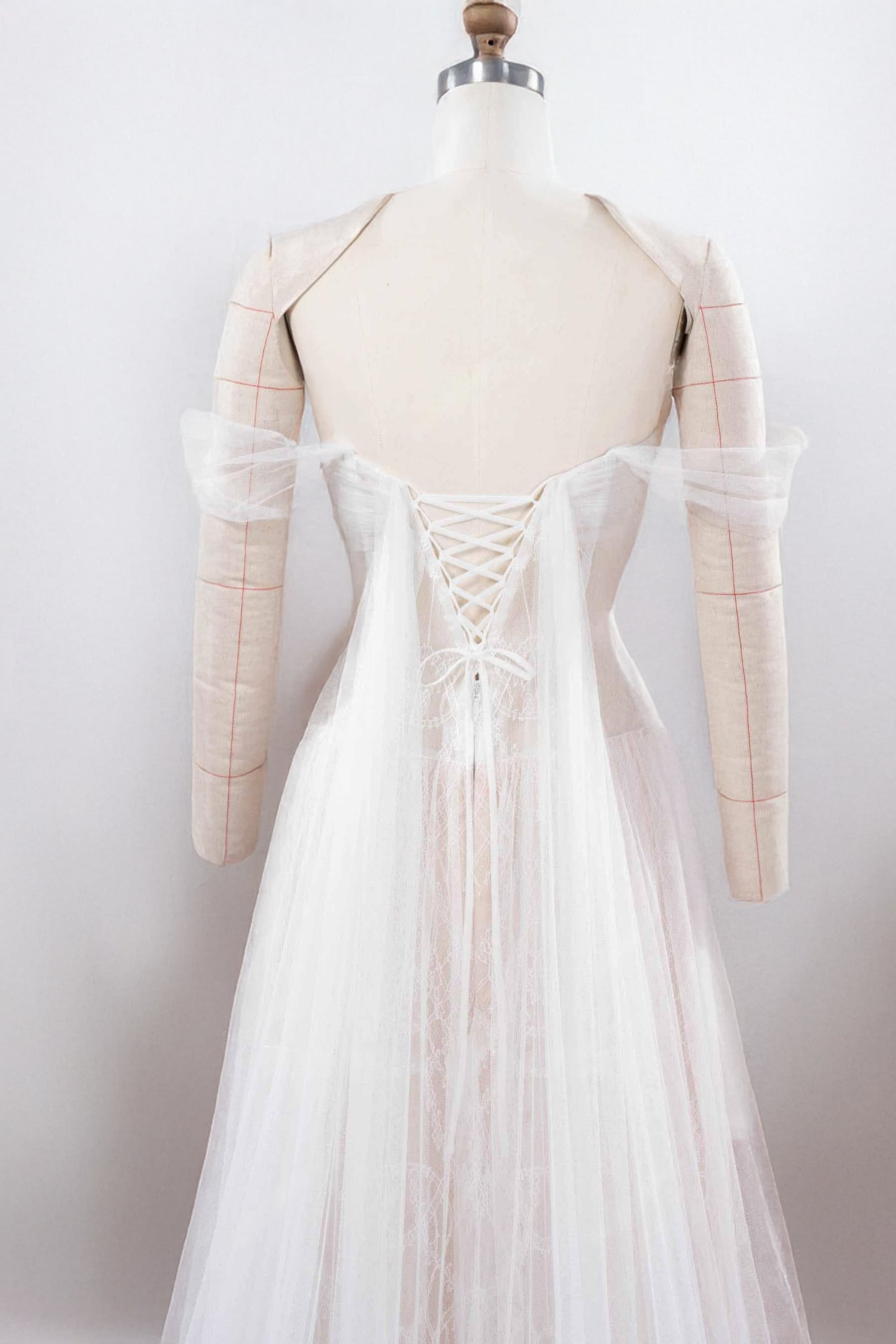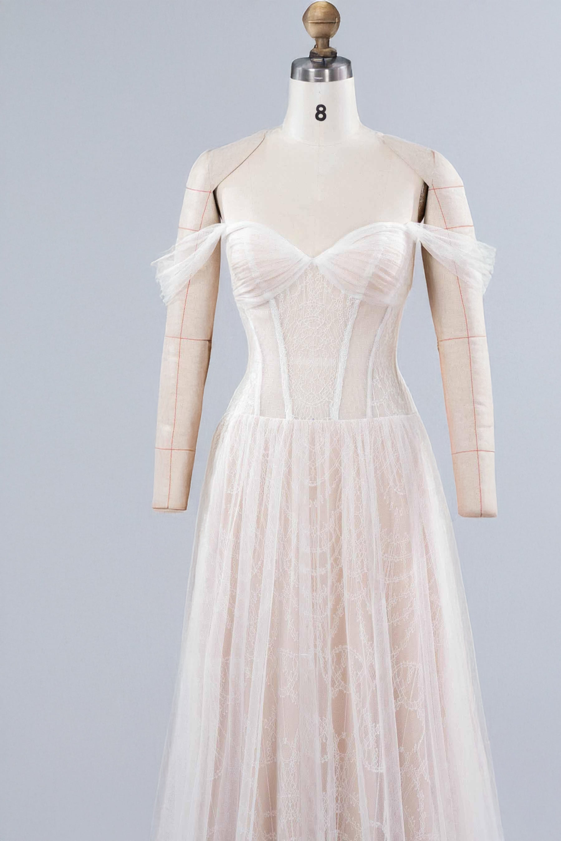 A floaty, destination-ready A-line in ultra-soft tulle. Mia features a pleated off-shoulder sweetheart neckline, a figure-flattering drop waist with visible corset boning, and a romantic lace-up back. Long tulle panels and a graceful sweep train move beautifully with every step.