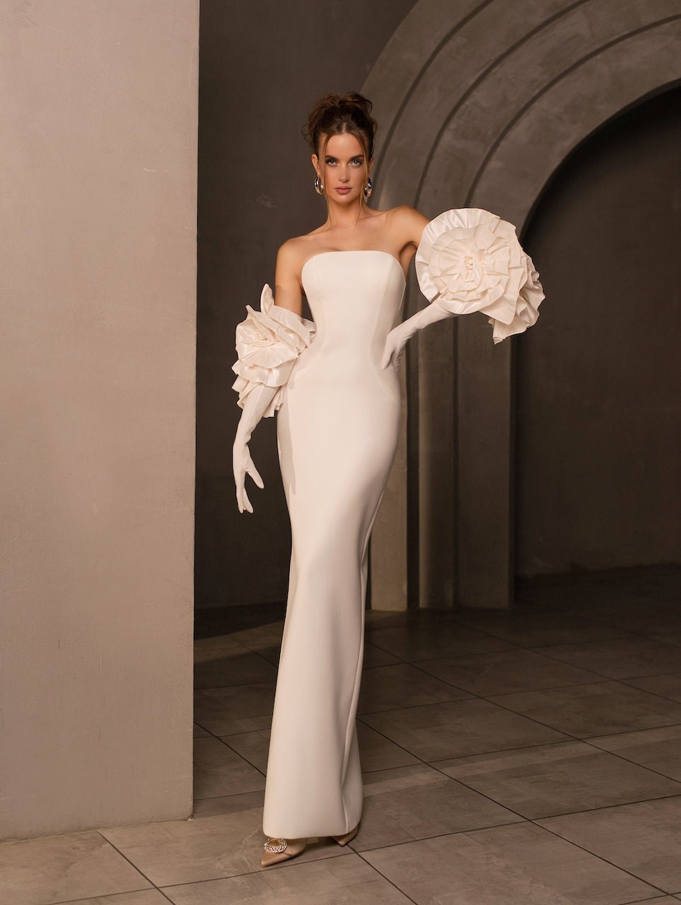 Embrace simplicity and sophistication with our minimalist sleeveless strapless sheath wedding dress. Featuring a straight neckline, A-line silhouette, unique puff gloves, floor-length design, and a fitted backless style, this gown from A&M Bridal is perfect for your special day.