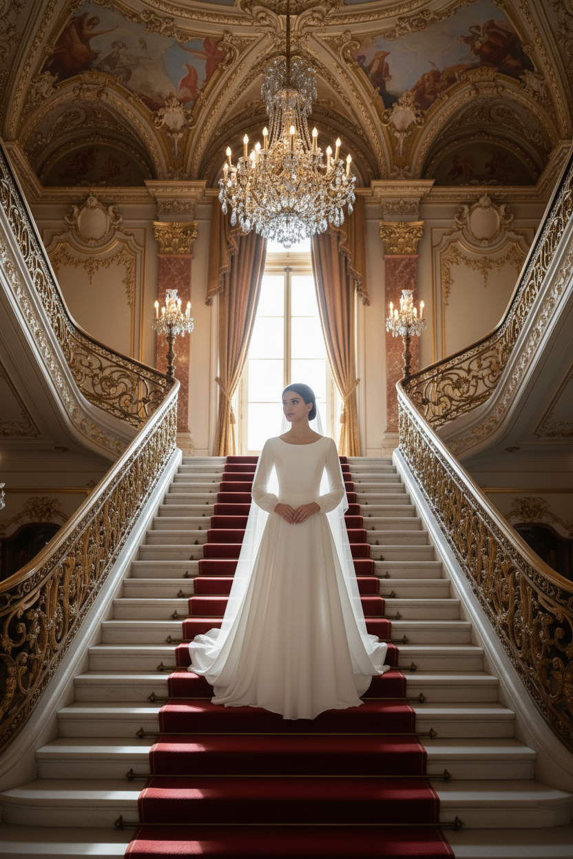 Gracefully timeless, the “Aofie” wedding gown by Adela Designs offers understated sophistication for brides who adore classic elegance. Crafted from flowing chiffon, this gown features a soft A-line silhouette with long sheer sleeves, a modest scoop neckline, and delicate lace detailing at the waist and cuffs. The sweeping train adds just the right amount of drama, perfect for gliding down the aisle. Ideal for traditional ceremonies, minimalist weddings, or brides seeking a refined, modest bridal look, Aofie promises effortless beauty that never goes out of style.