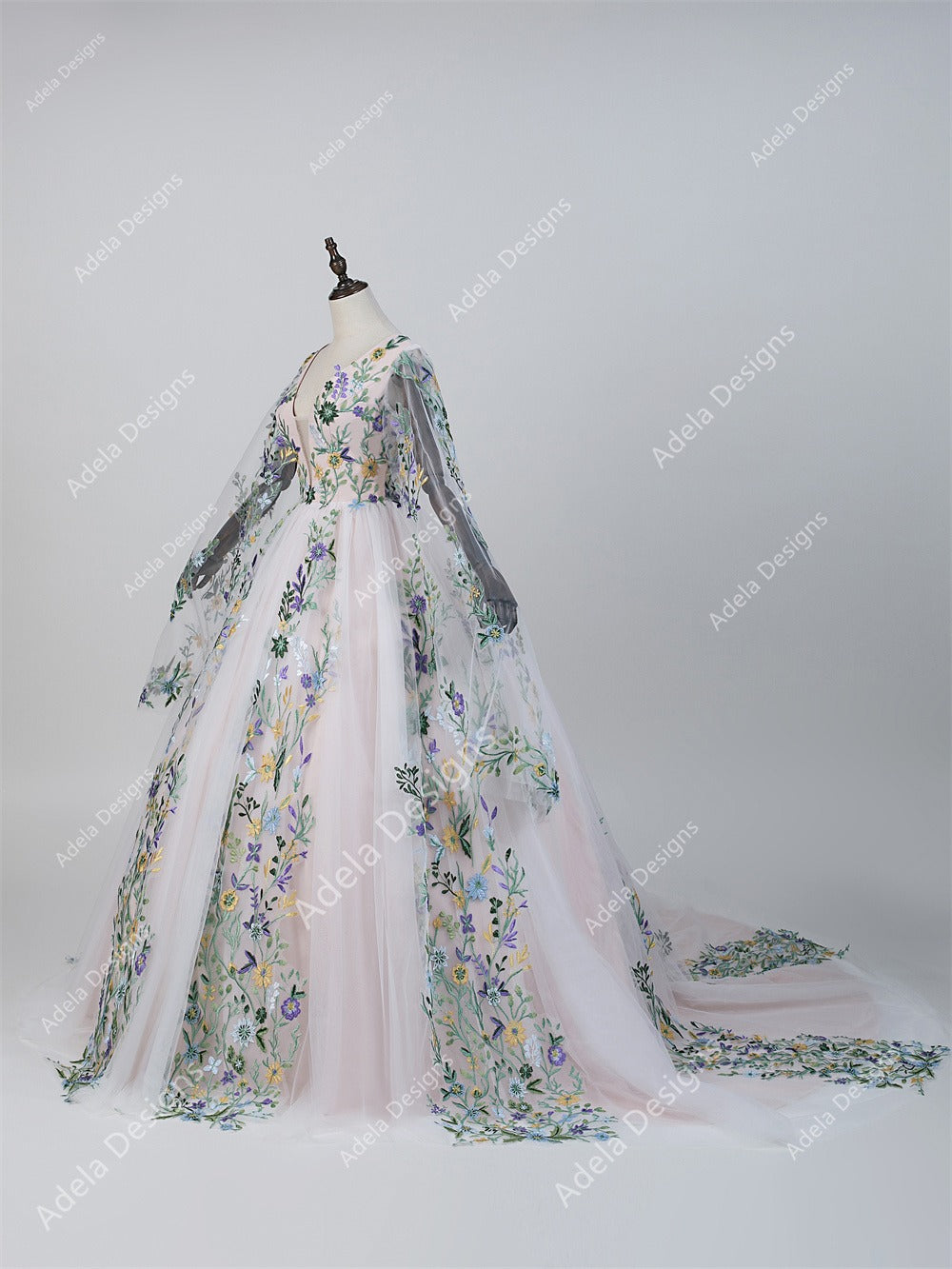 Monique – Floral Embroidered A-Line Wedding Dress with Cape Sleeves & Blush Pink Lining