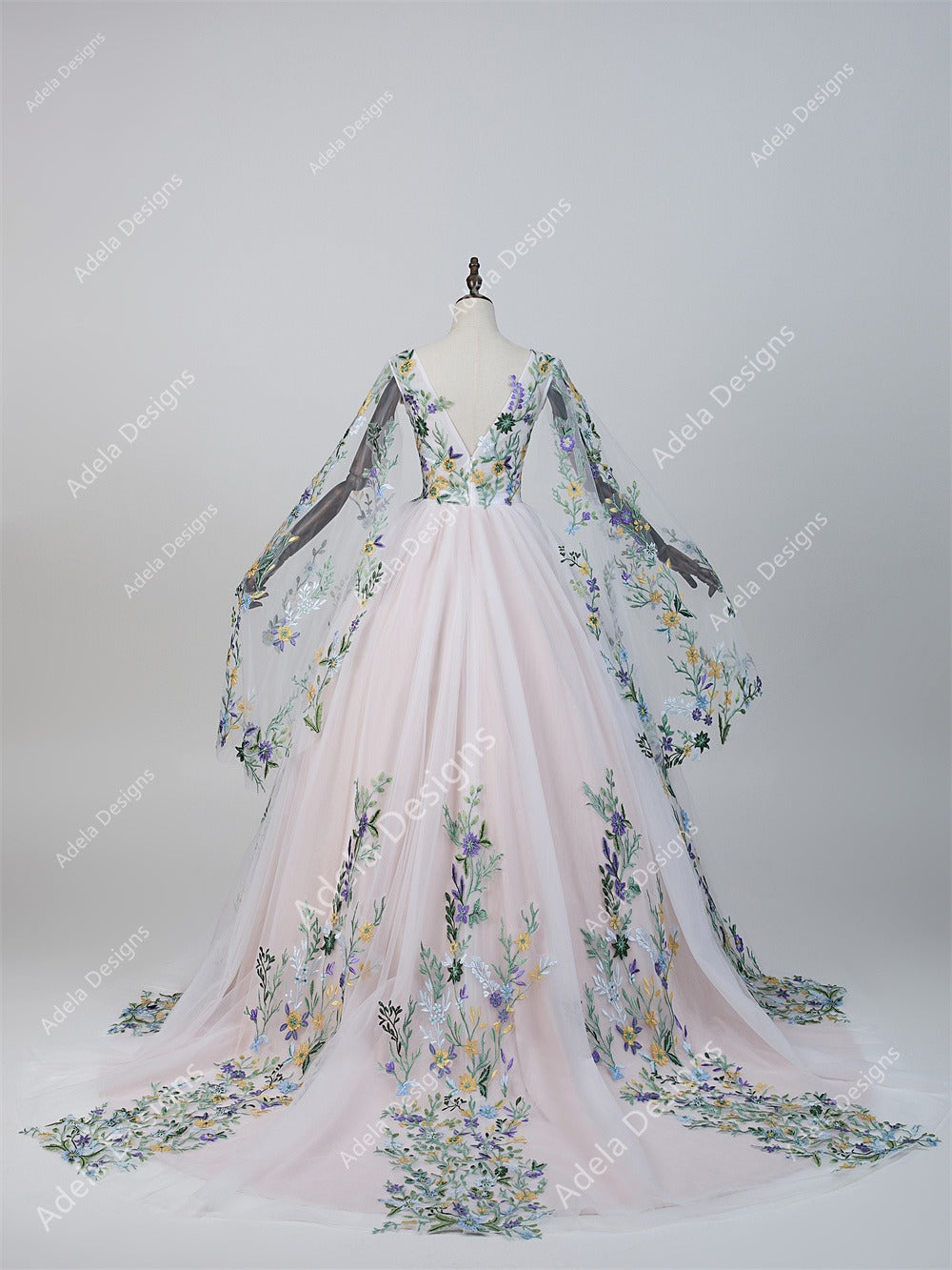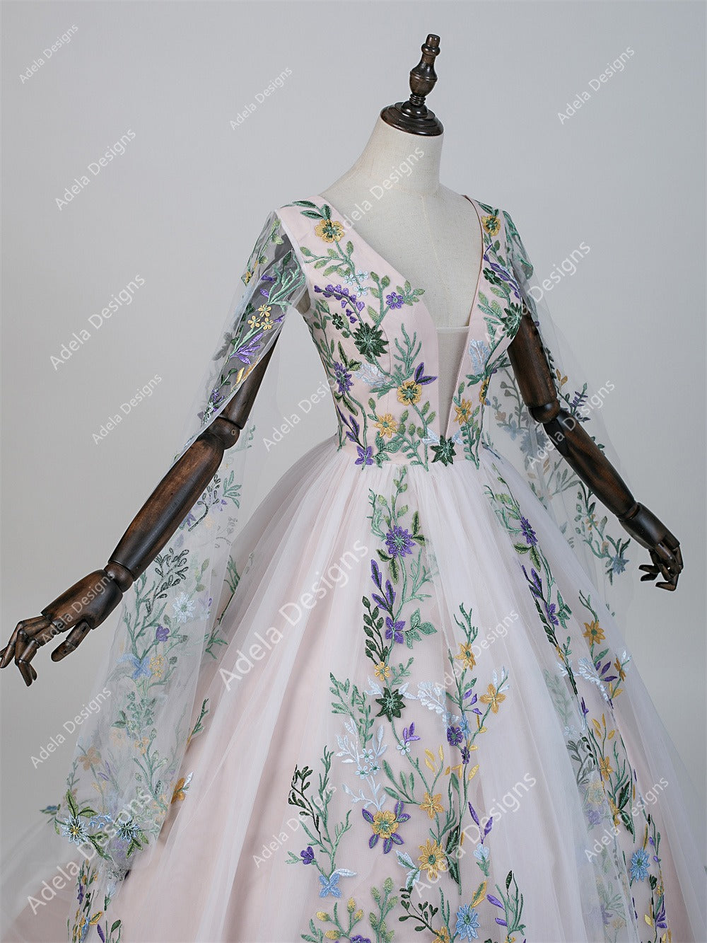 The gown is crafted with layers of ivory tulle and detailed multicolor floral embroidery, all floating over a warm blushing pink lining that adds depth and subtle whimsy. The floral motifs cascade organically down the skirt and train, giving Monique an ethereal garden-bride aesthetic that photographs beautifully in natural light.