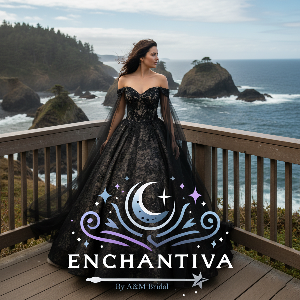 Layers of luxurious lace and tulle create depth and movement, while the subtle shimmer beneath adds a touch of modern romance. Perfect for gothic weddings, black-tie events, or dramatic photo shoots, Morena embodies both dark allure and timeless sophistication.