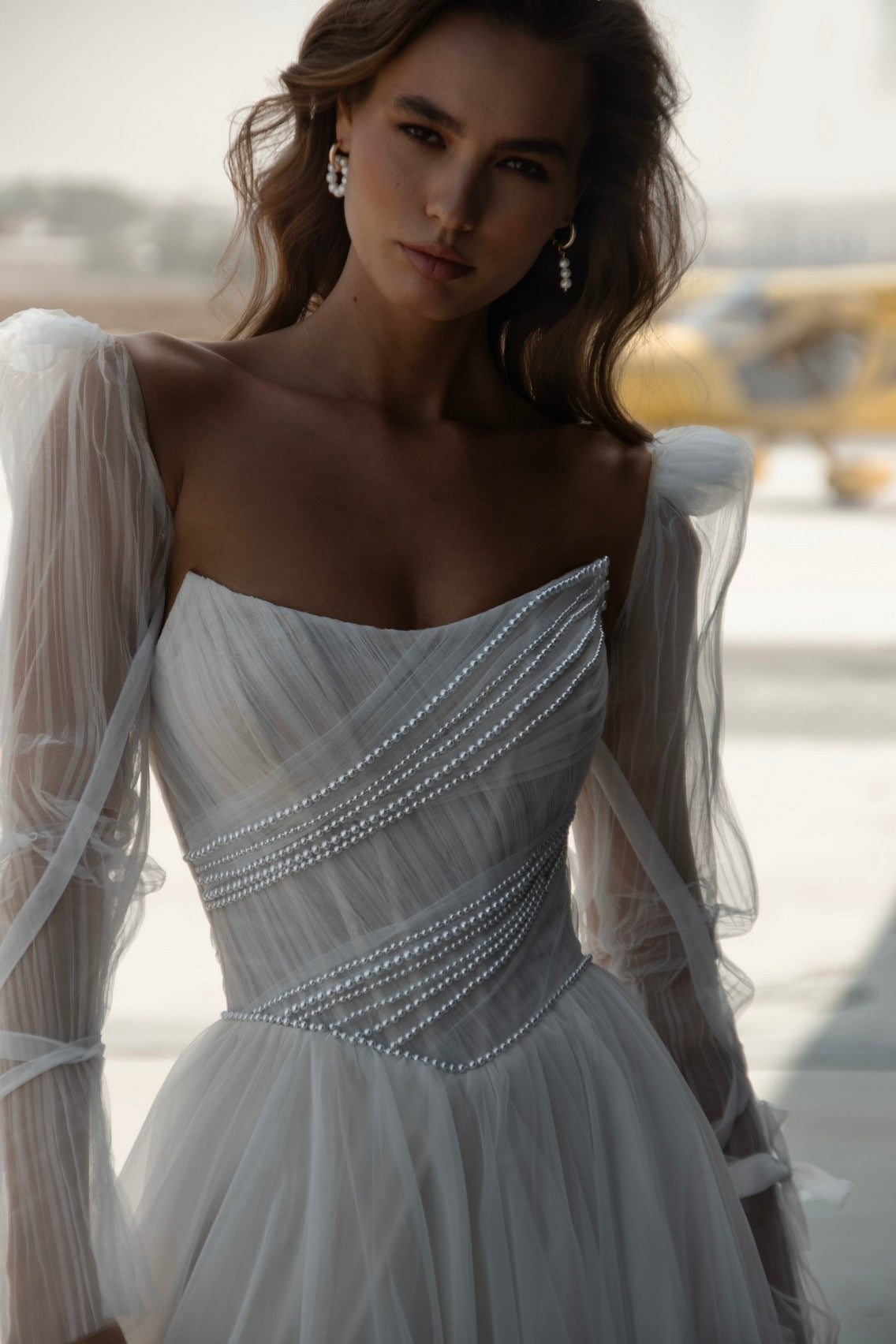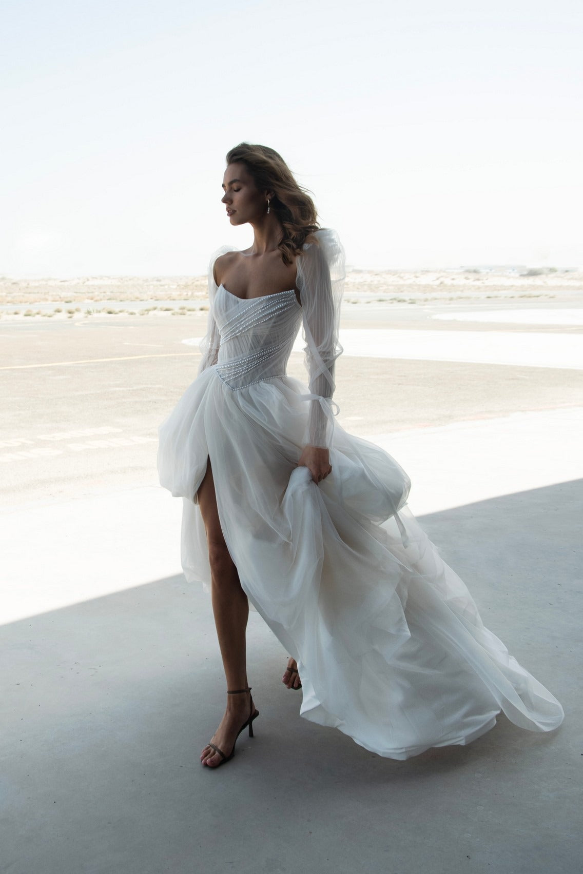 Meet Kris, a modern-romance A-line wedding gown crafted in light, airy tulle. The structured, strapless bodice is artistically draped and finished with pearl beading that traces the waist and neckline. A leg-revealing slit balances softness with confidence, while detachable sheer puff sleeves let you choose between ethereal coverage or a clean, strapless look for the reception. Minimal weight, maximum movement—perfect for garden, destination, rooftop, or museum weddings.