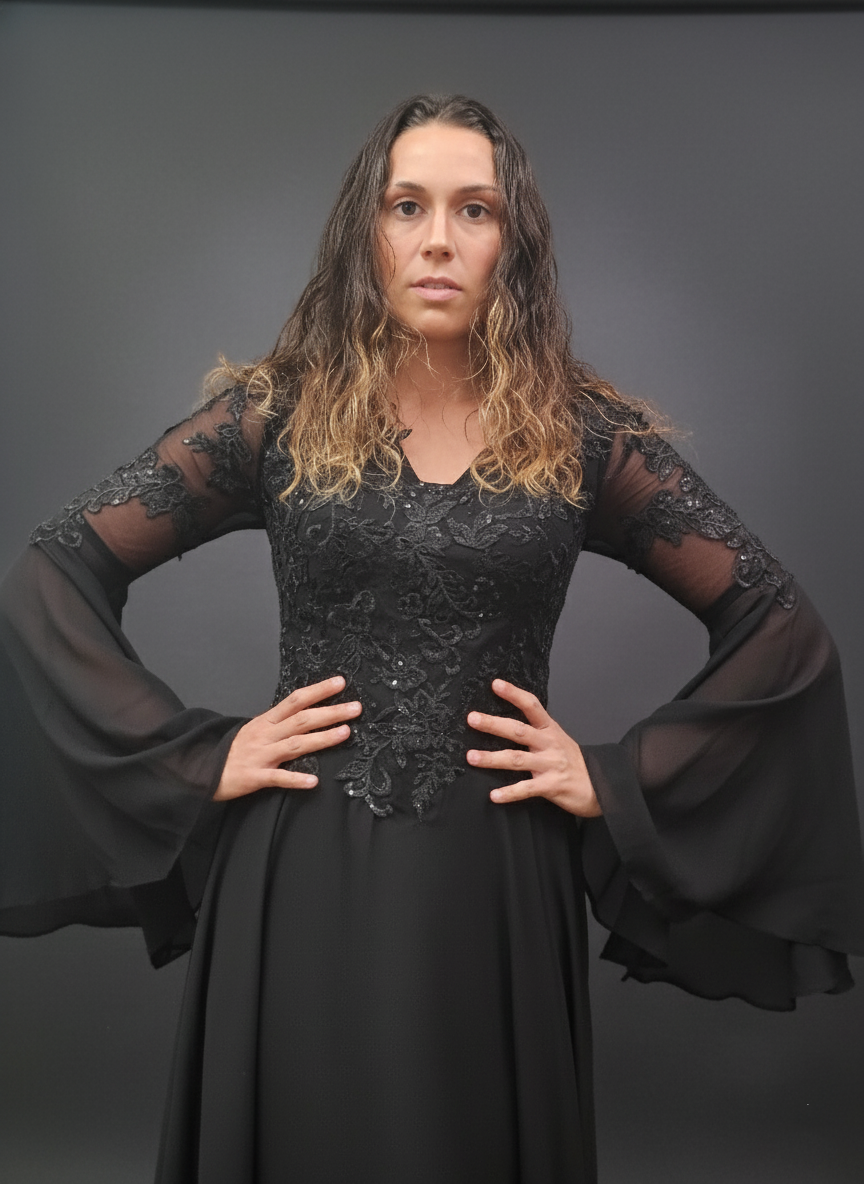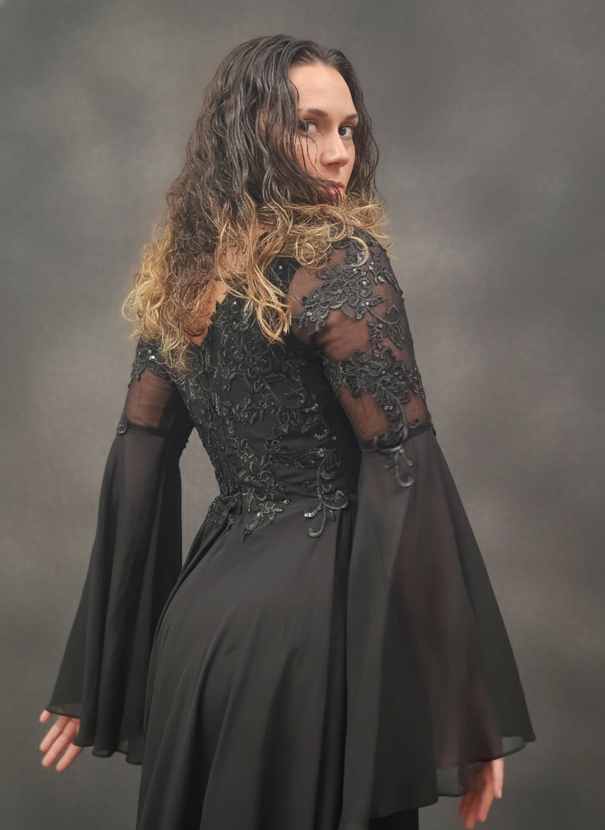 Octavia – Black Lace and Chiffon Gothic Wedding Dress with Dramatic Bell Sleeves and Flowing Train