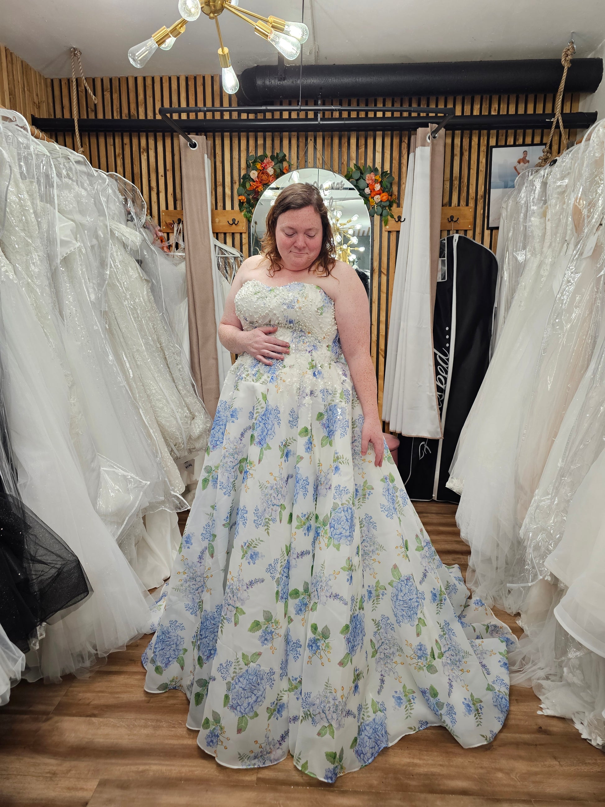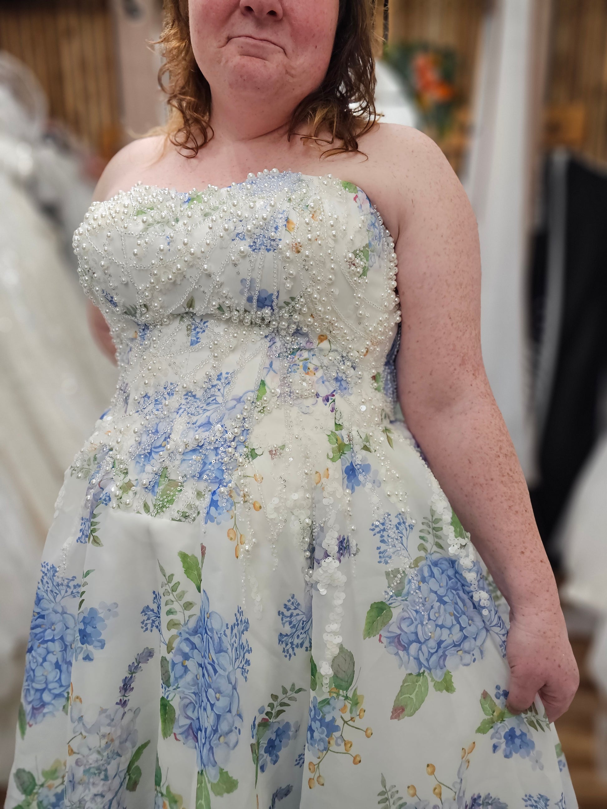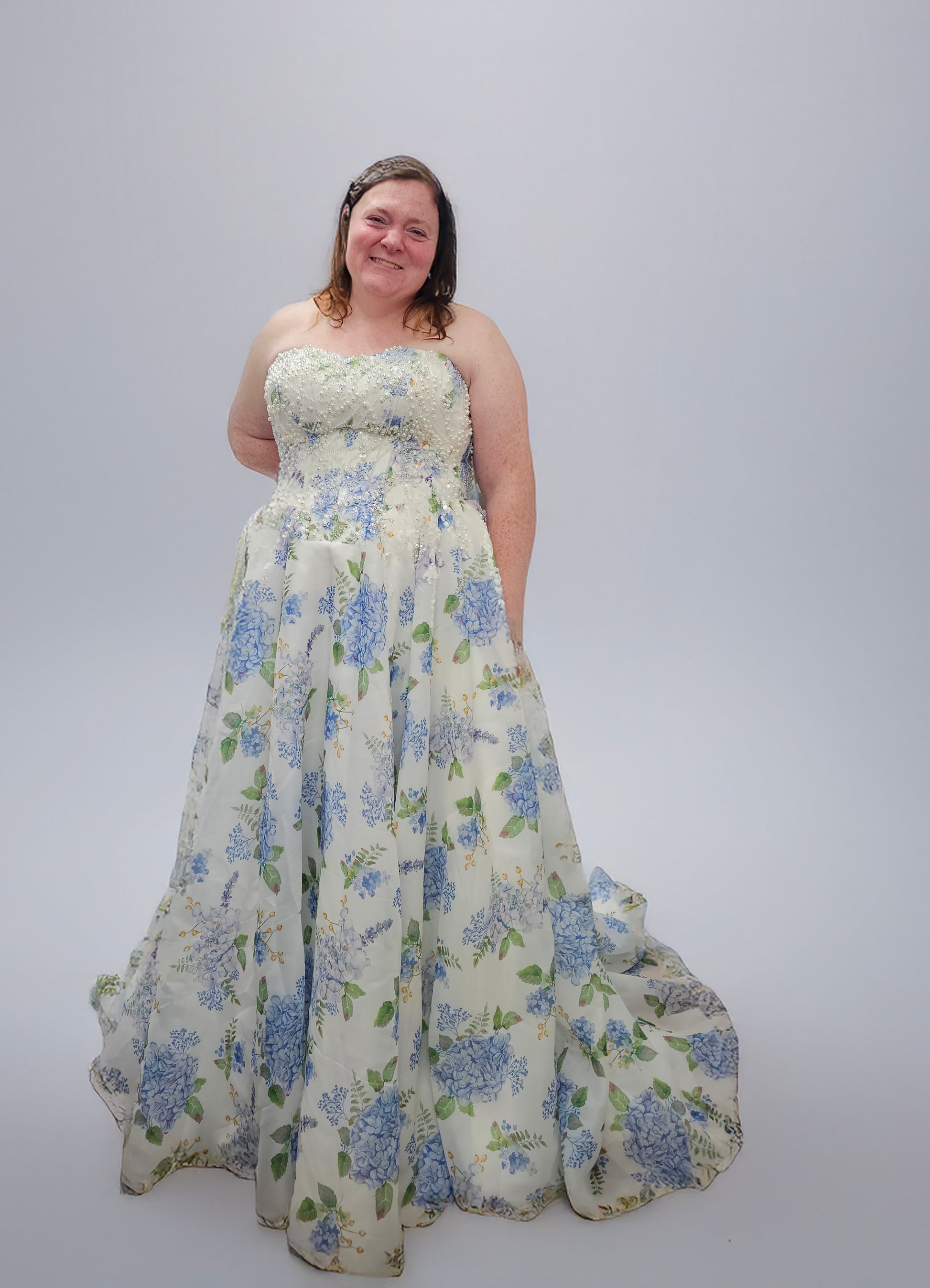 Channel the charm of a blooming garden with the “Ondine” wedding gown, a romantic floral masterpiece designed to capture hearts. Crafted with airy, lightweight fabric, this strapless A-line dress features delicate blue hydrangea prints scattered over a soft ivory background. The beaded bodice adds a subtle sparkle, while the lace-up back ensures a flattering, adjustable fit. Flowing into a graceful train, Ondine is perfect for spring and summer weddings, garden celebrations, or any bride seeking a fresh, enchanting look that blends classic bridal elegance with whimsical floral flair.