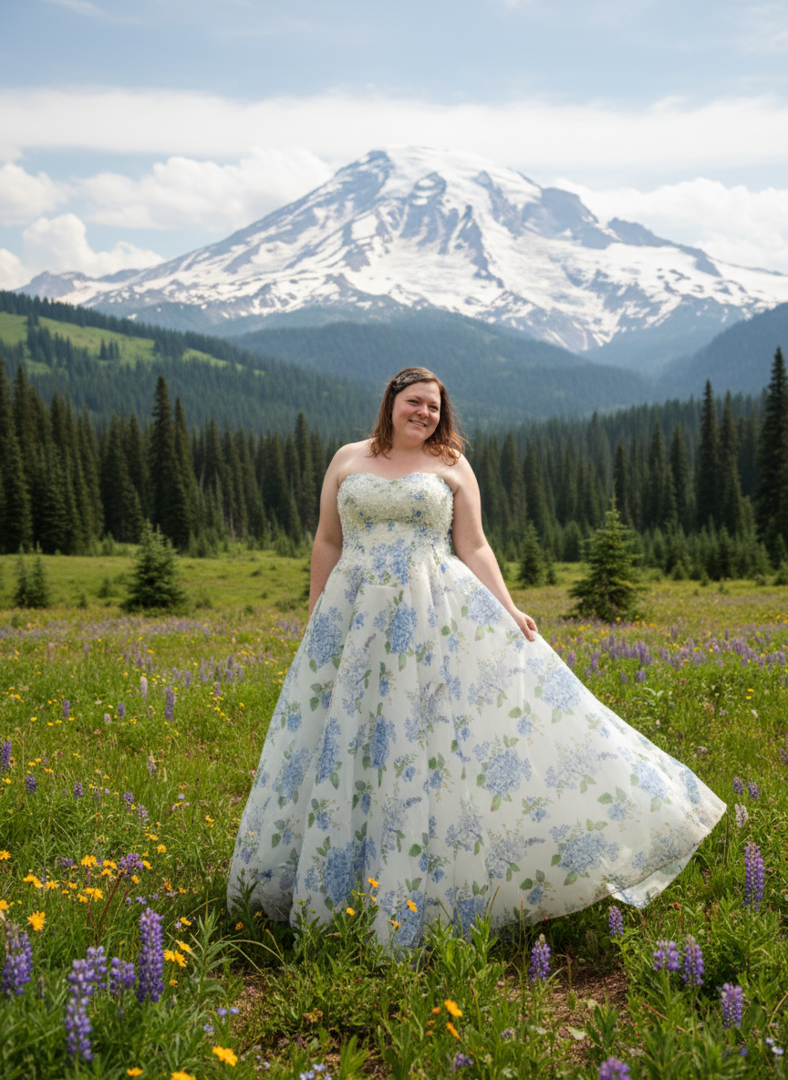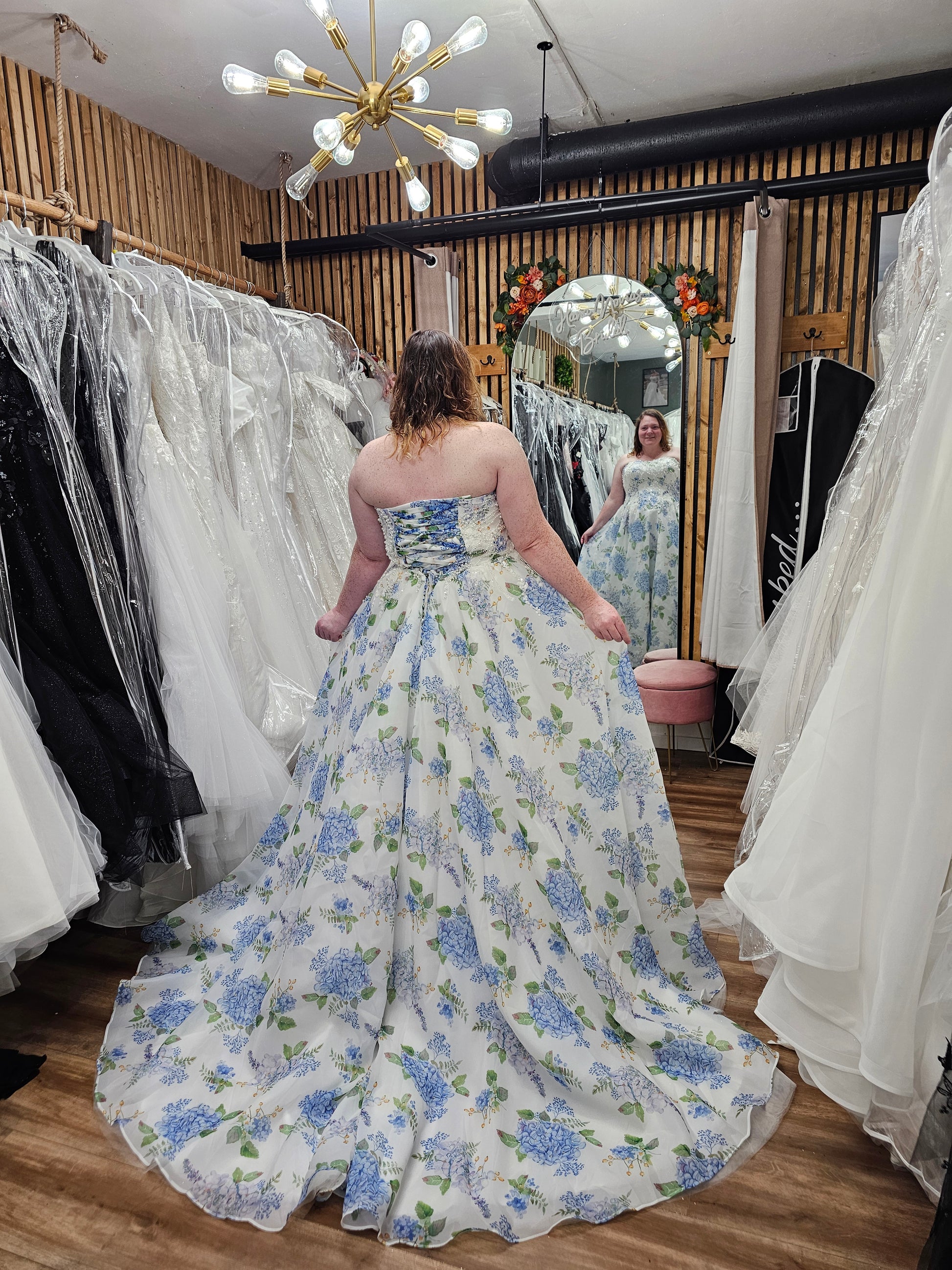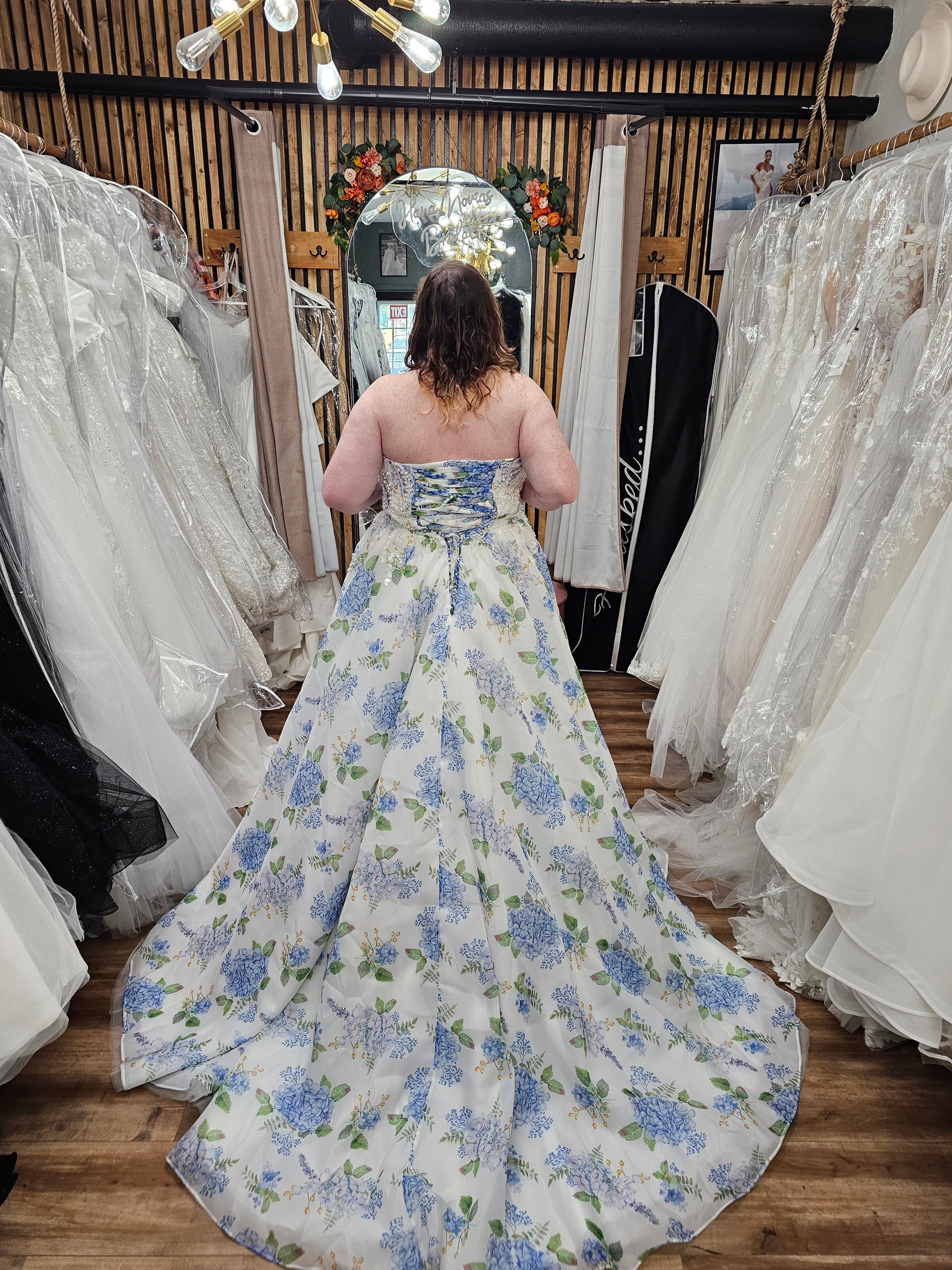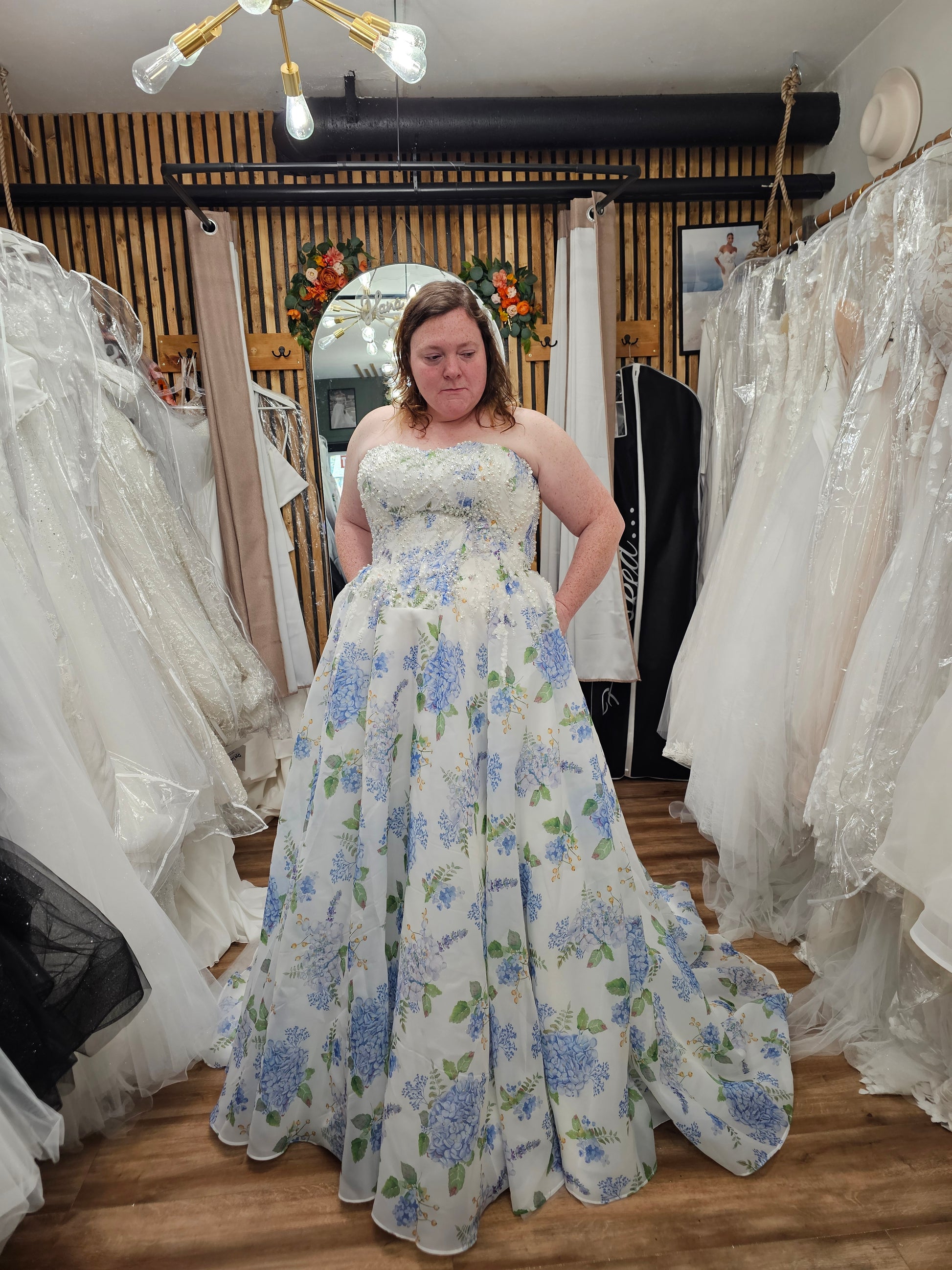 Channel the charm of a blooming garden with the “Ondine” wedding gown, a romantic floral masterpiece designed to capture hearts. Crafted with airy, lightweight fabric, this strapless A-line dress features delicate blue hydrangea prints scattered over a soft ivory background. The beaded bodice adds a subtle sparkle, while the lace-up back ensures a flattering, adjustable fit. Flowing into a graceful train, Ondine is perfect for spring and summer weddings, garden celebrations, or any bride seeking a fresh, enchanting look that blends classic bridal elegance with whimsical floral flair.