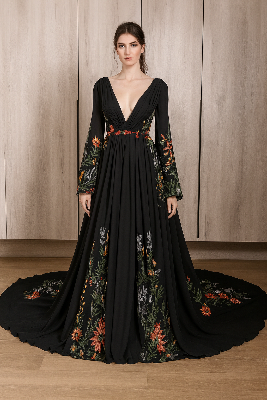 Embrace dark romance and vintage elegance with the Oriana wedding dress. Crafted from flowing black chiffon, this ethereal gown is adorned with intricate floral embroidery, blending gothic sophistication with a touch of nature-inspired beauty. The deep V-neckline and dramatic open back create a bold yet elegant silhouette, while the long, billowing sleeves add a regal, medieval charm. Perfect for alternative brides, gothic weddings, and enchanted garden ceremonies, this dress is a statement of individuality and timeless allure. Available in custom sizes for the perfect fit.