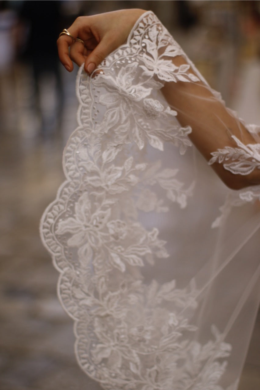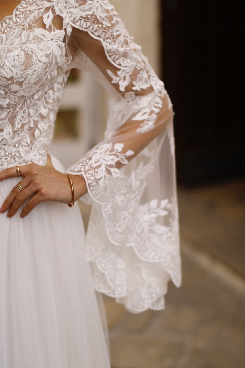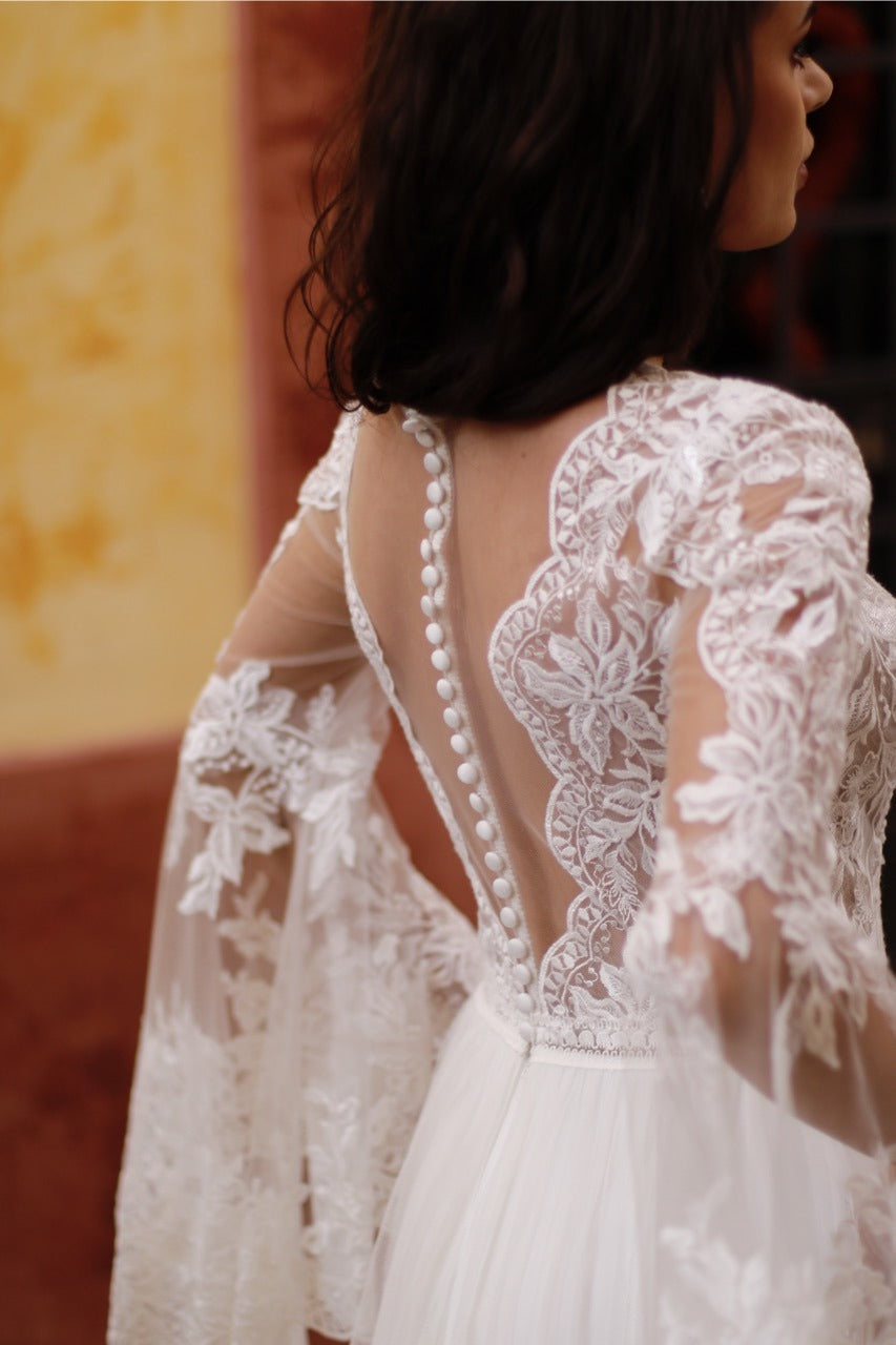 Dramatic, stunning, and purely bohemian, Florianna is a breathtaking A-line wedding dress designed for brides who want to make a statement. The bodice features magnificent lace appliqués that flow seamlessly into dramatic long bell sleeves, adding whimsical movement and vintage-inspired romance. A deep V neckline at the front elongates the silhouette, while the intricate lace continues across the sheer back for eye-catching detail from every angle.
