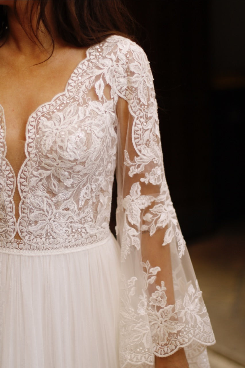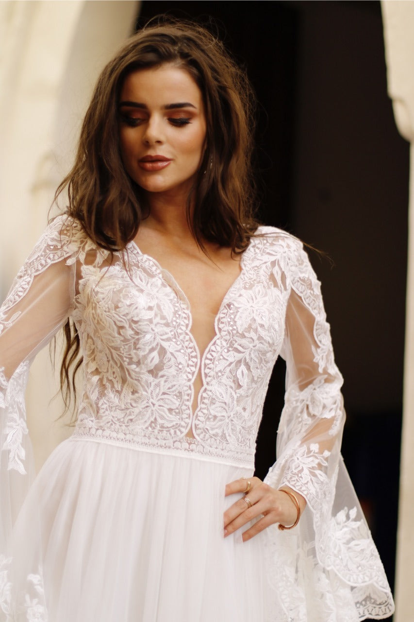 Florianna — Boho Lace A-Line Wedding Dress with Bell Sleeves & Deep V Neck