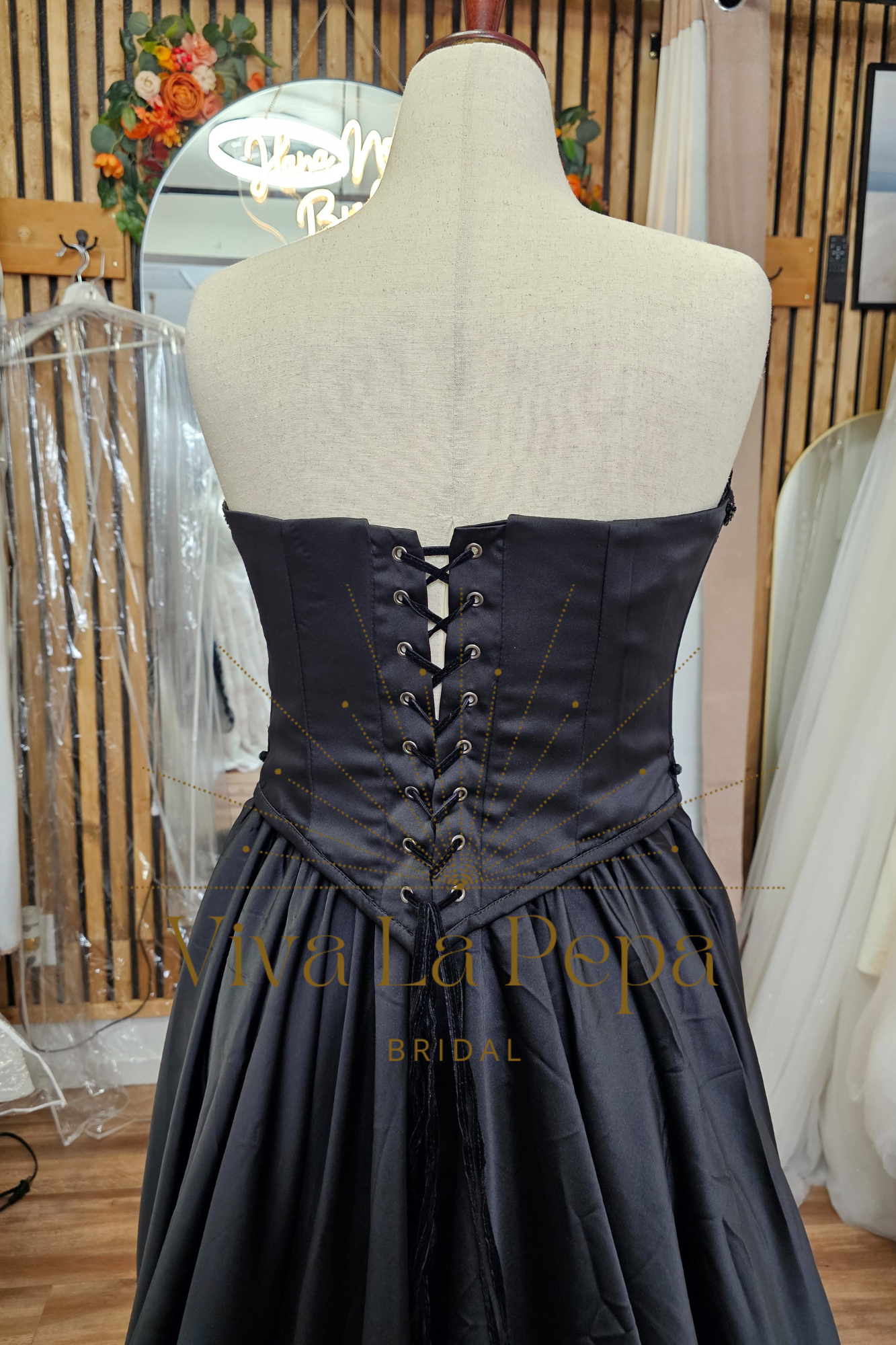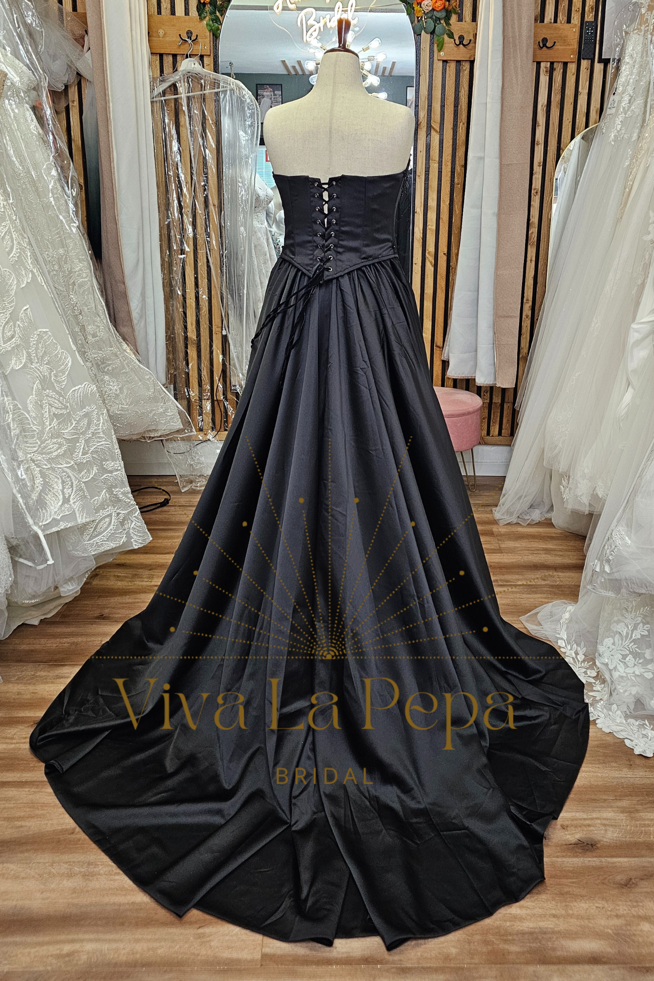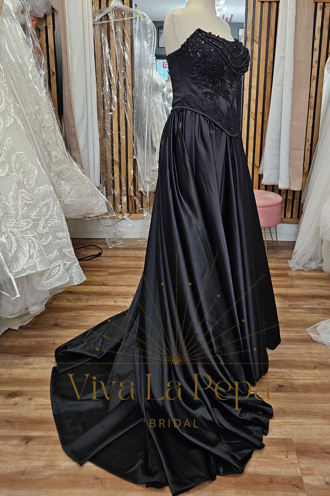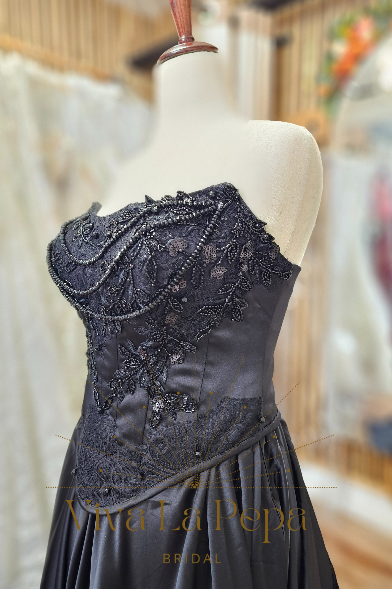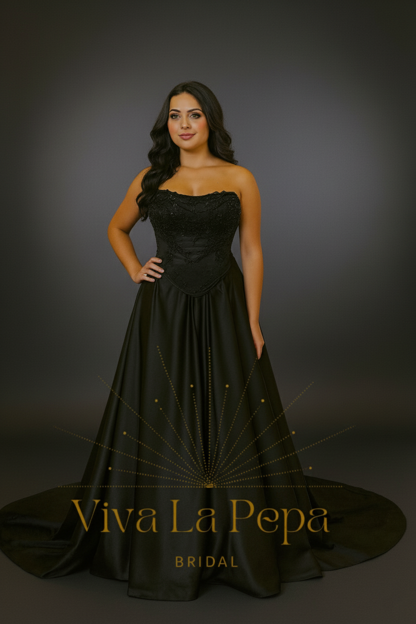 Own the aisle in Raven’s Whisper—a couture black wedding dress for the modern, alternative bride. This dramatic two-piece bridal set pairs a sleek strapless satin base gown with a detachable beaded lace corset overlay. The corset’s sculpting seams and lace-up detail frame the waist, while the full satin skirt flows into a cathedral-style train for cinematic movement. Wear both pieces for the ceremony, then switch to the minimalist base gown for a second look at your reception.
