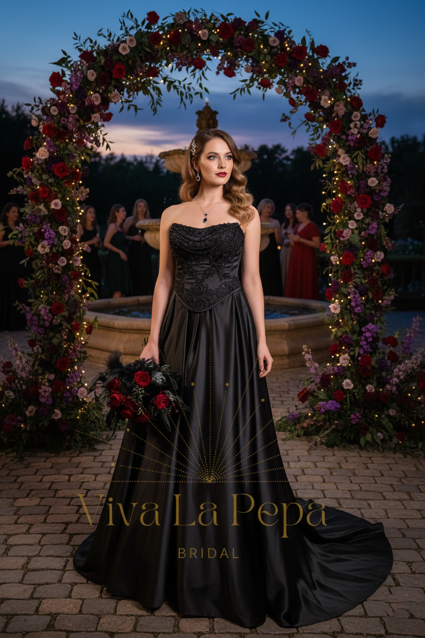 Who it’s perfect for: gothic, moody, or evening weddings; art-deco venues, castles, and industrial lofts—any setting where dark romance shines.