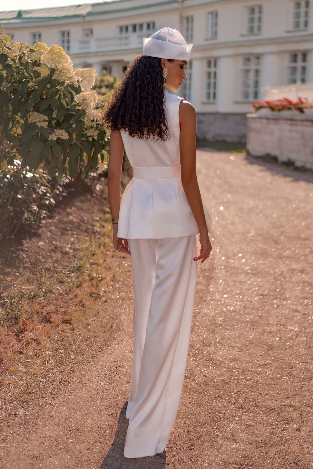 Featuring a structured corset-style bodice paired with tailored bridal trousers, Rebel creates a sleek, elongated silhouette that feels both commanding and refined. The design balances clean lines with delicate detailing, making it ideal for modern weddings, courthouse ceremonies, fashion-forward celebrations, and brides who want something unforgettable.